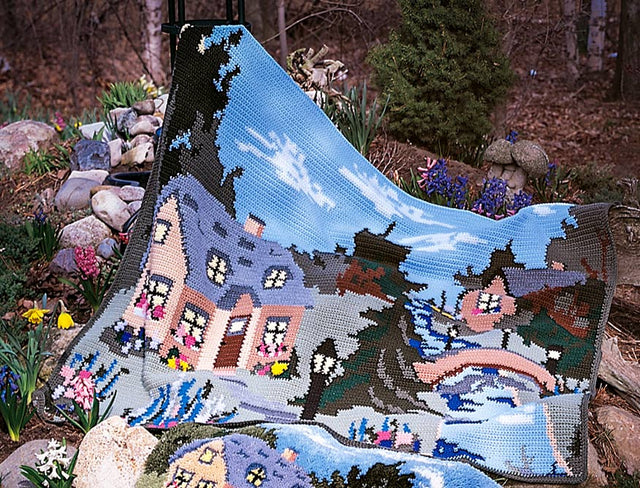 Create this striking scenic afghan with our exclusive graph-style pattern! Create a show-stopper as a focal point in your home decor when you drape this over a chair or bed! As beautiful as it is to look at, you'll be warm and snug in this as well! Created with Mary Maxim Starlette worsted weight yarn, which provided 190 yds per 100-gram ball at the time. Discover our amazing selections of worsted-weight yarn, in all your favorite brands! Keep in mind yardage varies. We recommend Premier Anti-Pilling worsted for this project! Materials List: MC Lt Blue (4 balls), Lt Willow Green, Med Willow Green, Dk Willow Green (3 balls each). Lt Grey, Med Grey, White, Sand, Lt Taupe, Holly Green (1 ball each). Med Blue, Chocolate (105 yds each). Med Rose, Soft Yellow, Lilac (70 yds each). Black, Saffron Yellow, Lt Old Rose, Baby Pink, Purple (35 yds each), and crochet hooks size H/8 (5 mm), and J/10 (6 mm). Finished size 61 x 48" (155 x 122 cm)—Intermediate crochet.