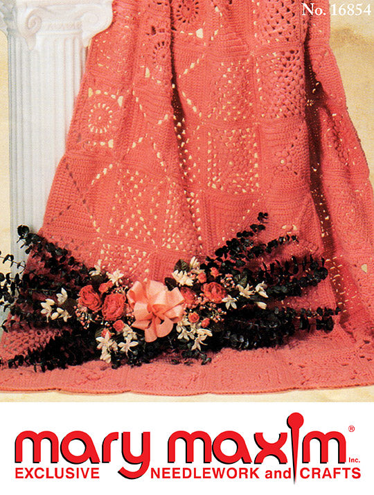 Create a cozy afghan using Mary Maxim Worsted Weight yarn with this fun sampler squares pattern. It features a variety of block designs and stitches to make and join. Ideal for beginners who’ve mastered the basics and are excited to try out some fresh new stitches! Materials List: Worsted yarn (14 skeins), and crochet hook size I/9 (5 mm). Finished size 43 x 55" (109 x140 cm)—Beginner with experience.