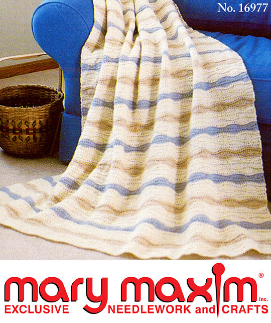 Crochet this beautiful afghan using Mary Maxim worsted weight yarn, featuring a unique stitch pattern that forms gentle waves in soothing shades reminiscent of a peaceful day by the beach. Ideal for adding charm to your cottage or lakefront retreat. Crafted with Mary Maxim Starlette worsted weight yarn, each skein offered 220 yards at the time. Explore our wide selection of worsted-weight yarns, including Starlette, to customize this cozy piece in colours that perfectly complement your home. Materials List: MC (9 skeins), CC1 (3 skeins), CC2 (2 skeins), and crochet hook size U.S. I/9 (5.50 mm). Finished size 48 x 66" (122 x 167.5 cm)—Intermediate crochet.