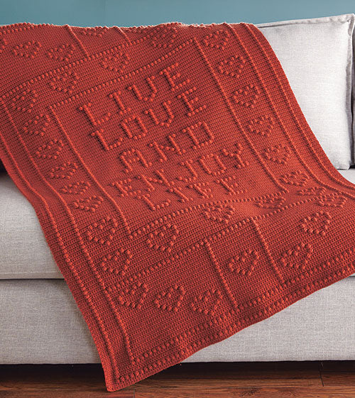 True words to live by surrounded by hearts. Designed by Nancy Liggins. Kit includes Mary Maxim Starlette yarn and instructions. Requires crochet hook size 4.0 mm. Finished size: 40 x 58". Intermediate Crochet.