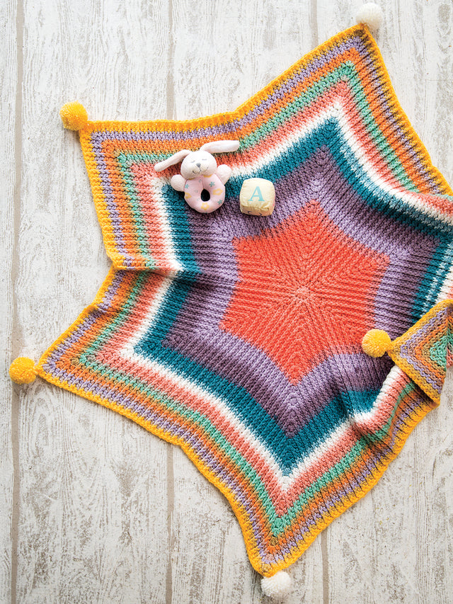 A fun and colourful blanket for your little one. Kit includes Lion Brand Mandala yarn and instructions. Requires crochet hook size 4.50 mm. Finished size 37.5" point to point. Easy Crochet.