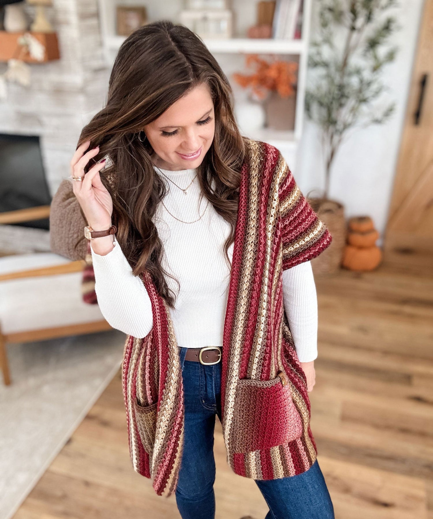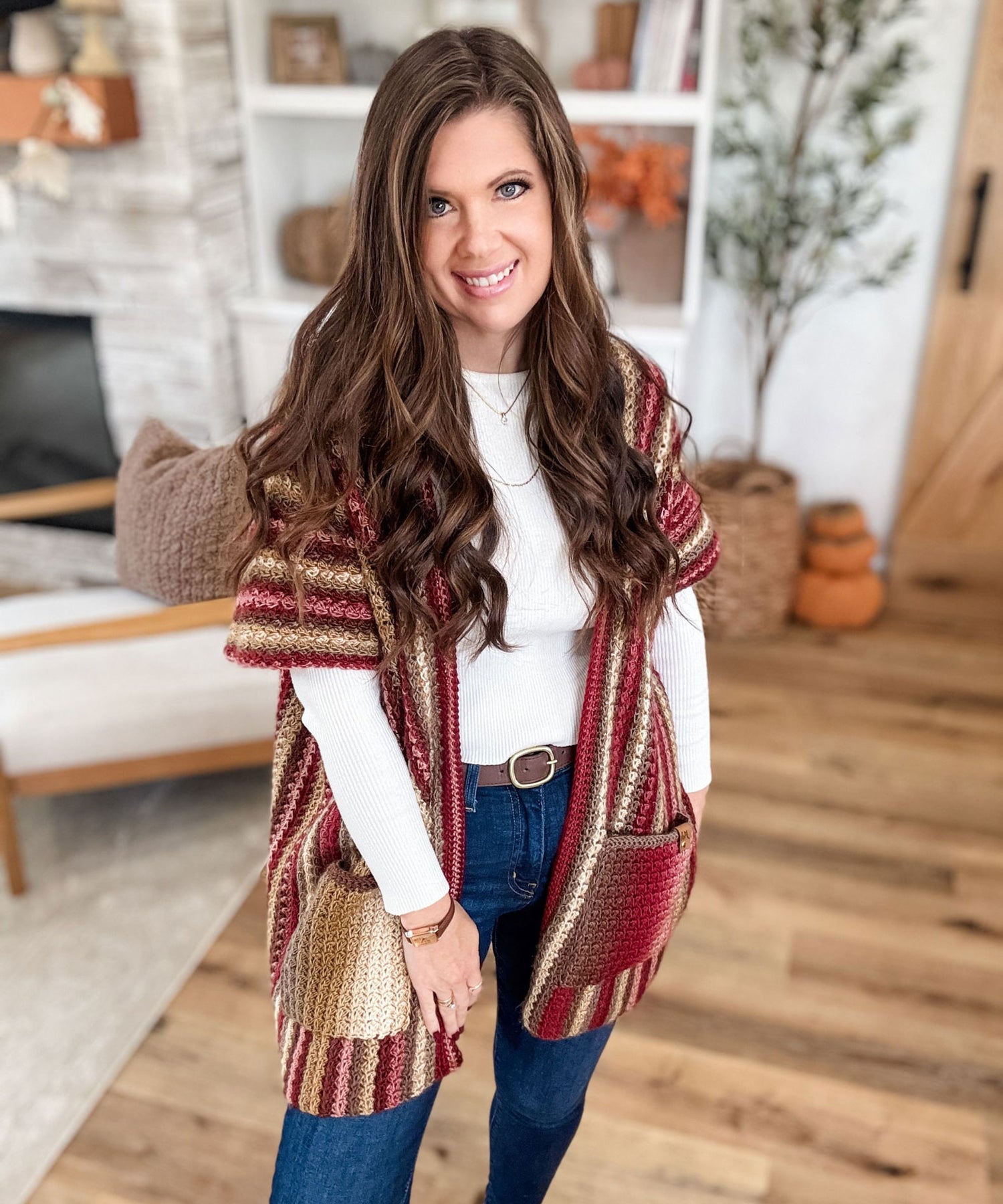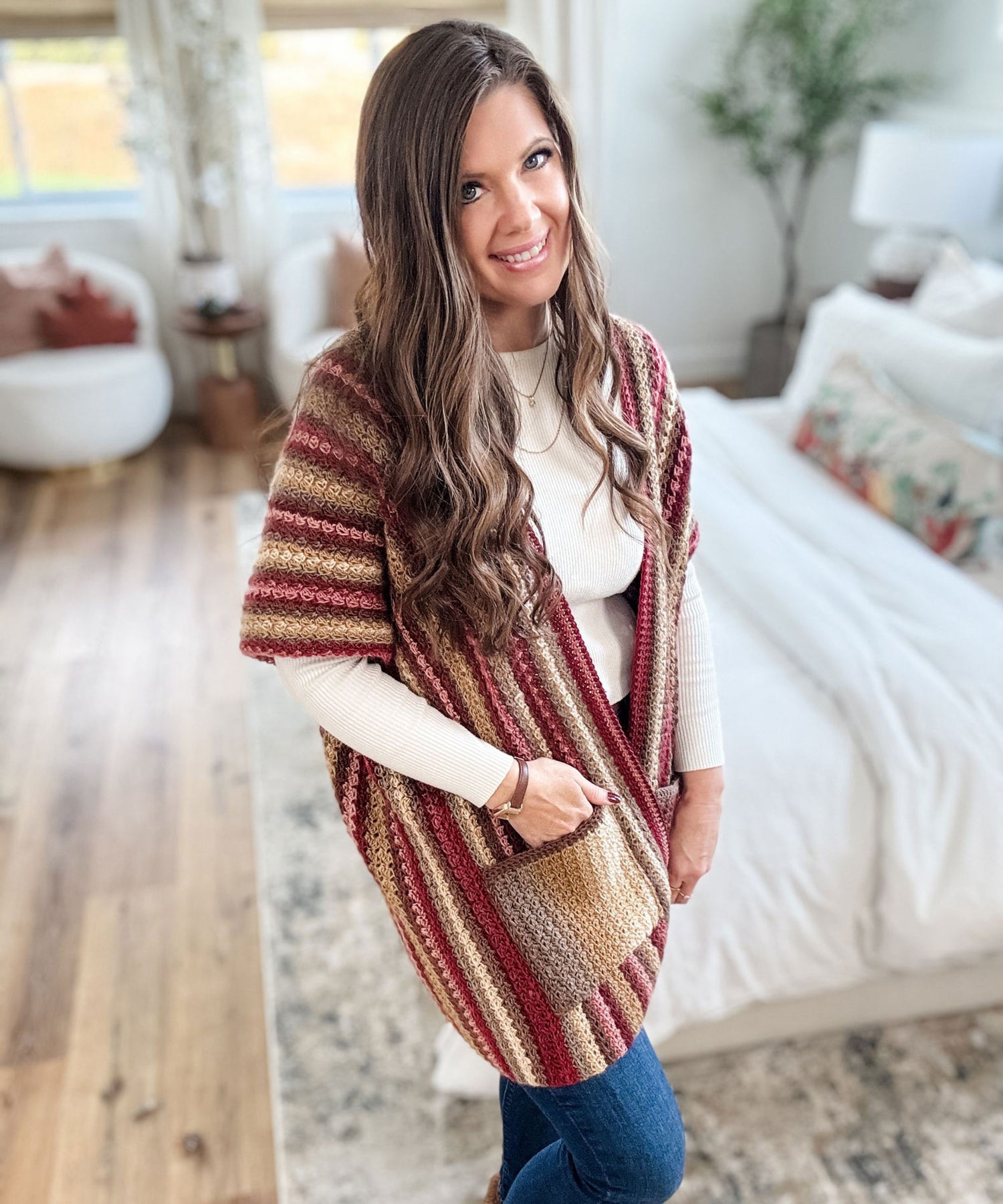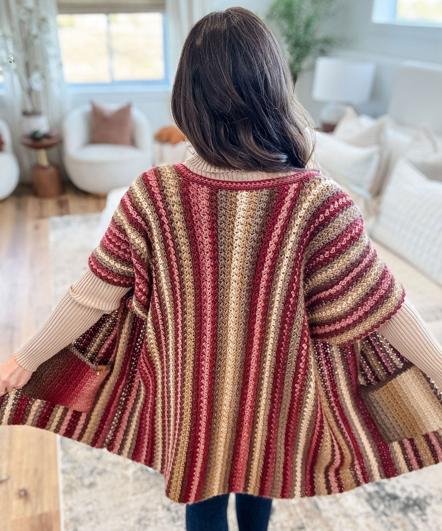 Wrap yourself in cozy elegance with The Suzette Ruana—a timeless piece that's equal parts comfort and style. This charming open-front layer features practical pockets and breezy short sleeves, perfect for those "just right" temperature moments. Watch as gorgeous vertical colour transitions flow down the fabric, creating visual interest with every wear. It's the kind of piece that makes you feel put-together without trying too hard. Texture meets fashion in a design that'll become your go-to for effortless, layered looks. Designed by MJ's Off The Hook. Kit includes Mary Maxim Prism yarn and instructions. Requires crochet hook size 5.0 mm. Tag not included. Sizes: XS-5X. Easy Crochet.