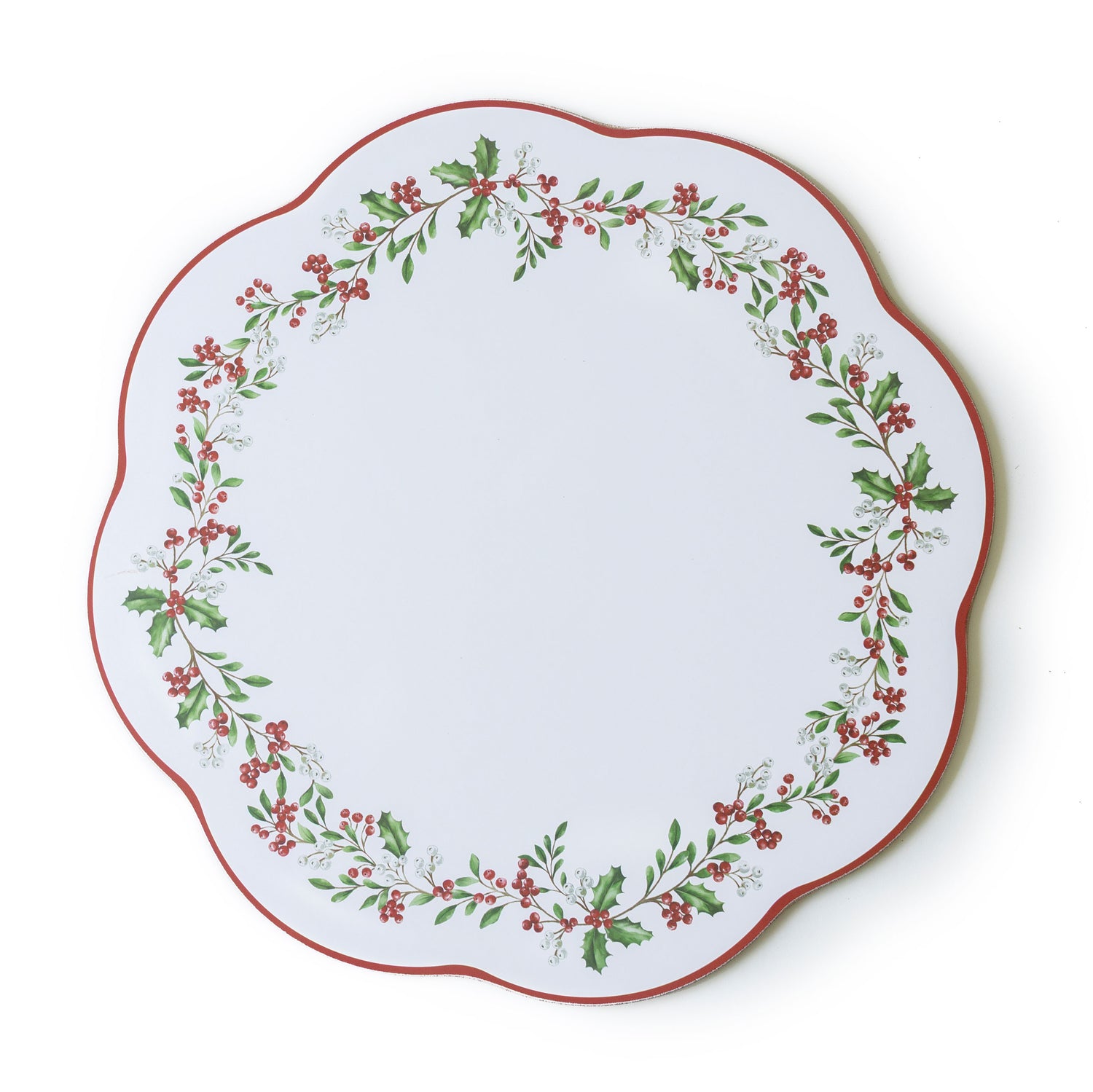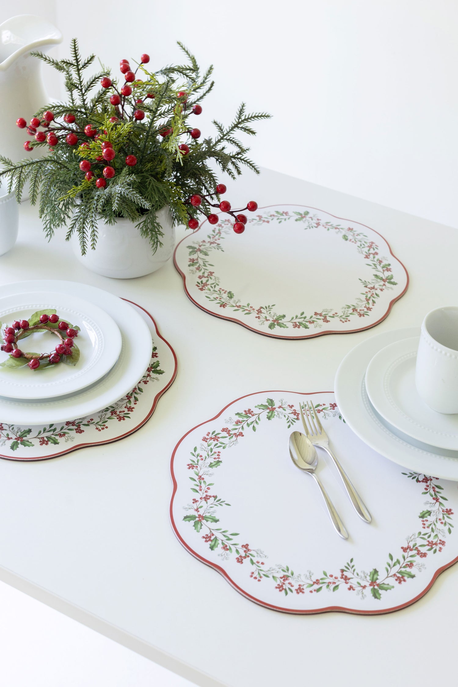 Add a festive touch to your holiday gatherings with the Holly Wreath Cork Placemats. Featuring a delicate festive wreath design and elegant scalloped edges, these placemats create a warm and inviting atmosphere for every meal. The 14-inch round shape perfectly accommodates plates and utensils, while the cork backing ensures they stay firmly in place without slipping. Crafted for durability, these placemats resist wear and can be enjoyed year after year. Sold as a set of four, they provide ample coverage for your dining table, making holiday meals even more special and mess-free. Celebrate Christmas with style and practicality.