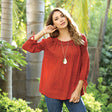Upgrade your summer wardrobe with our Burgundy Round Neck Tunic! Fun and versatile, the simple lines and 3/4 tie sleeves makes it perfect for any occasion. Elasticized around the neck so you can wear it with the off-the-shoulder look. Versatile enough to be paired with jeans or a skirt, this loose fitting tunic is a must-have for your summer vacation. 100% rayon.