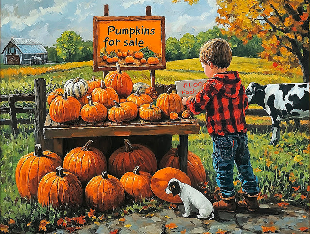 Immerse yourself in the warmth of autumn with the Fall Sale Jigsaw Puzzle, featuring an adorable little farmhand proudly selling his bountiful harvest of pumpkins at a charming country roadside stand. This engaging puzzle captures the essence of the harvest season, making it an enjoyable way to celebrate fall traditions. Perfect for family gatherings or quiet evenings, it brings a nostalgic touch to your puzzle collection while encouraging focus and relaxation. Experience the cozy spirit of autumn and create lasting memories as you complete this delightful scene. Size 24 x 18". 300 pieces.