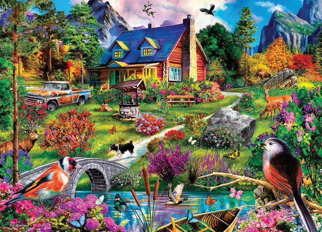 Escape to tranquility with the Hillside Retreat Jigsaw Puzzle, offering a vibrant scenic picture of a charming countryside cottage surrounded by lush greenery and colourful flora. This detailed scene invites you to explore every corner, from the cozy cottage to the soaring mountains and radiant sky, making each piece a part of a peaceful getaway. Perfect for puzzle lovers who enjoy intricate designs and soothing imagery, it provides a fulfilling and relaxing challenge. Bring the serenity of the countryside into your home and unwind as you piece together this beautiful retreat. Size 26.75 x 19.25". 1000 pieces.