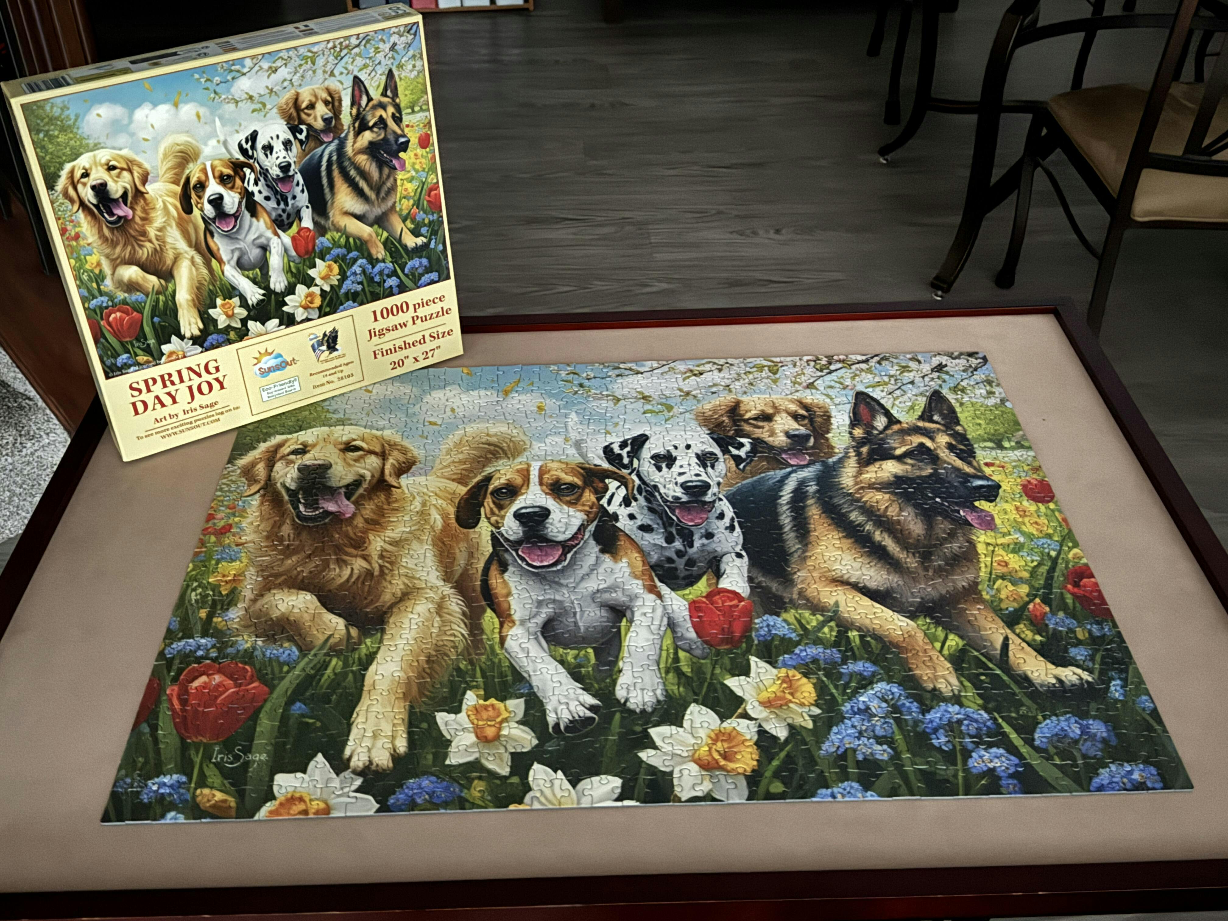 Experience the joy of Spring with our new puzzle, featuring playful pups running through vibrant blooms. Escape into a world of colour and happiness with Spring Day Joy Jigsaw Puzzle! Size 27 x 20". 1000 pieces.