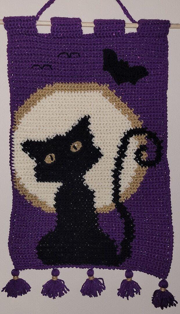 Your Halloween visitors will think this wall hanging is the cat's meow! The deep purple night sky is the perfect backdrop for this black tabby and his bat friends. Hang up year after year for that spooktacular touch. Kit includes Mary Maxim Starlette & Starlette Sparkle yarns, wooden dowel, and pattern to make as shown. Requires crochet hook size 5.0 mm. Size 14 x 20". Intermediate Crochet.