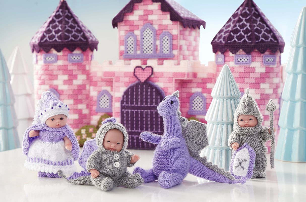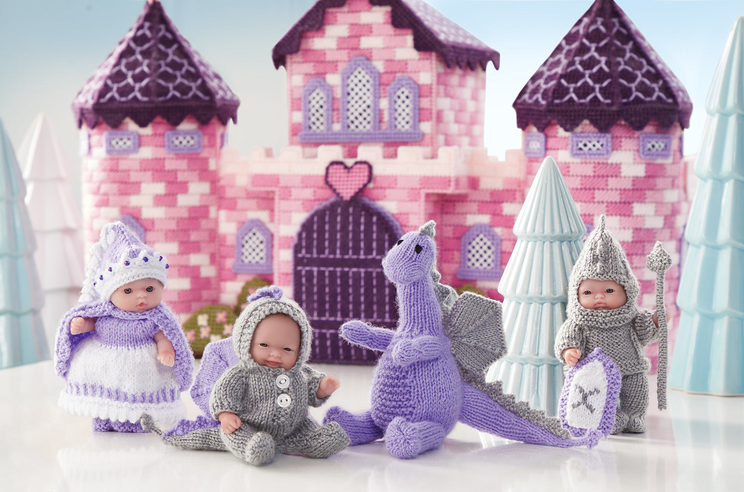Enchant your little one with the Fairytale Doll Collection! Enter this magical world of play with a mama dragon, 'baby' dragon, knight, and princess. Kids can explore their own special story and enjoy countless hours of imaginative fun! Kit includes Mary Maxim Twinkle yarns, one 5" doll (facial expressions will vary) and pattern to make 3 outfits and dragon as shown. Requires needles size 2.0 mm and DPNs size 2.0 mm. Intermediate Knit.