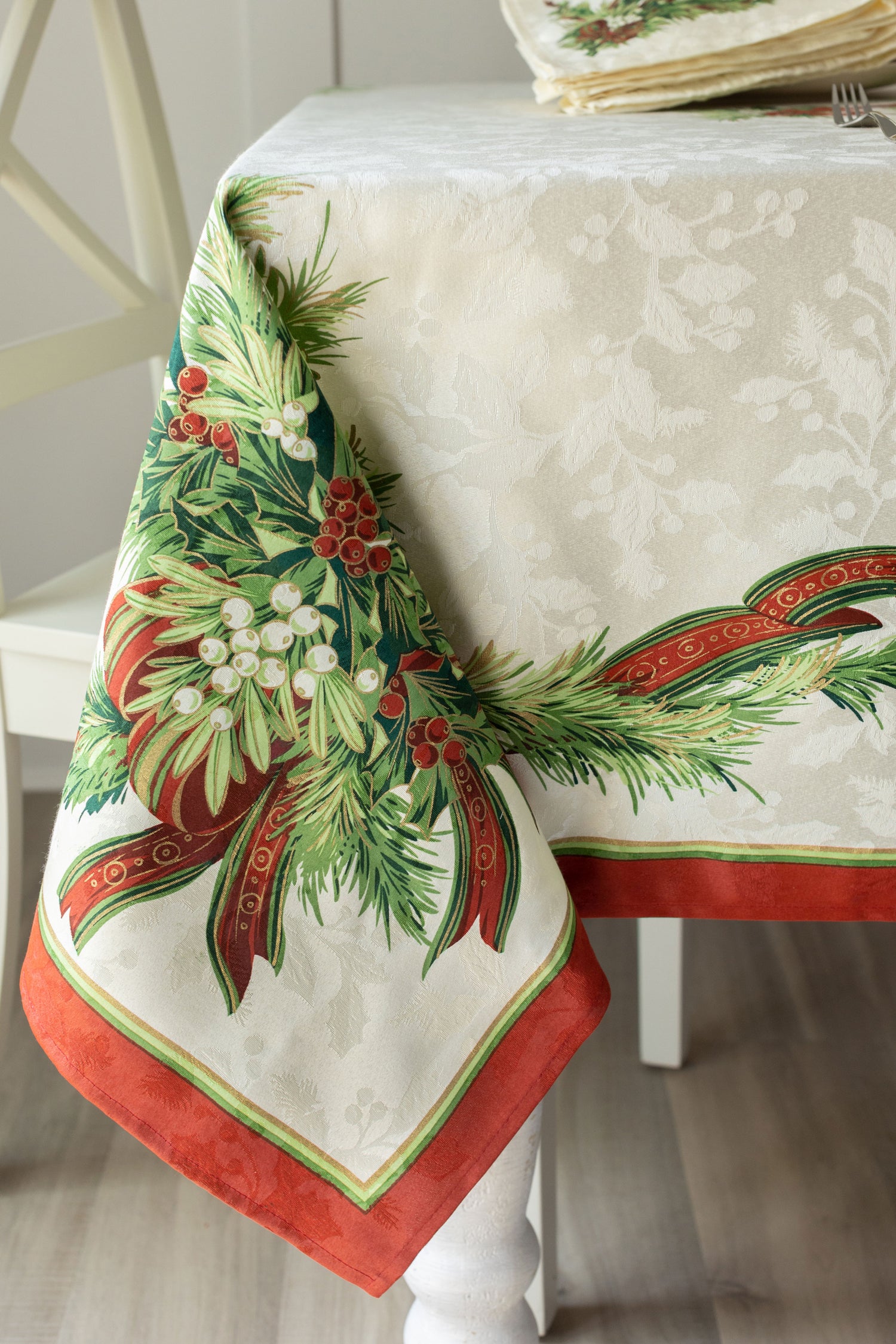 Celebrate the magic of the holiday season with our Christmas Ribbons Tablecloths, featuring a stunning array of winter greenery intertwined with elegant holiday ribbons and subtle touches of gold all set on a tone on tone ivory background. This festive design brings warmth and charm to any gathering, creating the perfect backdrop for making special memories with family and friends. Crafted to enhance your holiday décor, these tablecloths effortlessly combine beauty and holiday spirit, transforming your dining experience into a joyful celebration filled with tradition and style. Embrace the season’s cheer and make every meal unforgettable. 52% cotton, 48% polyester. Machine wash & dry for easy care. Napkins not included. Available in 5 sizes.