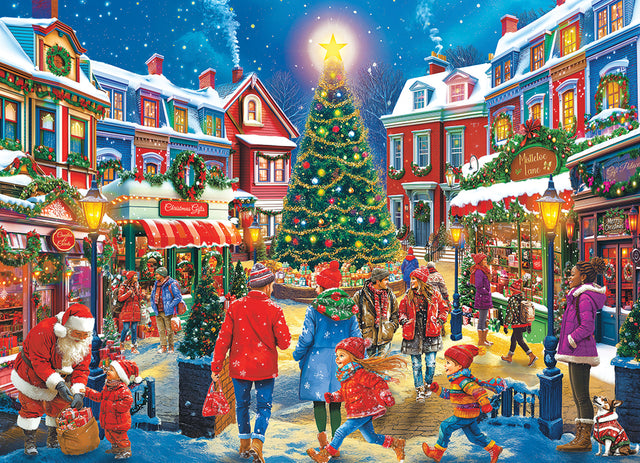 Step into a winter wonderland with this magical Christmas Village Jigsaw Puzzle! The town square comes alive with festive energy as families gather to celebrate the season, surrounded by twinkling lights and dazzling decorations that transform the evening into pure enchantment. Every corner sparkles with holiday spirit, from cheerful storefronts to snow-dusted rooftops, creating a scene that captures the warmth and togetherness of Christmas traditions. With vibrant colours and charming details throughout, this puzzle invites you to piece together a beloved holiday memory. Ideal for seasonal enthusiasts and puzzle lovers of all ages, it's the perfect way to spend cozy winter nights while creating a stunning display that brings the joy and nostalgia of a classic Christmas celebration right into your home. Size: 27 x 20". 1000 pieces.