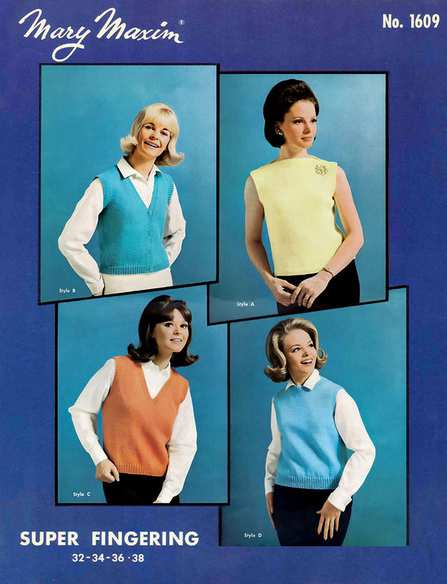 Unleash your creativity with these 4 stunning designs! Discover these same 4 designs also available in worsted weight PDL1845! This classic Mary Maxim pattern will guide you to knit the perfect addition to your wardrobe.  The original yarn used for this project was the Mary Maxim Kroy Twice Nice yarn, a fingering-weight yarn that offered 120 yards, on a 1 oz skein at the time. With a variety of fingering yarns to choose from today, there are endless possibilities when using this pattern. Keep in mind that yardage may differ. Materials List: Sz 32-34 (7 oz), Sz 36-38 (8 oz), knitting needles size U.S. 1 (2.25 m), 3 (3.25 mm), and 8" (20 cm) double point 1 (2.5 mm). Fits sizes 32-34-36-38—Intermediate knit.