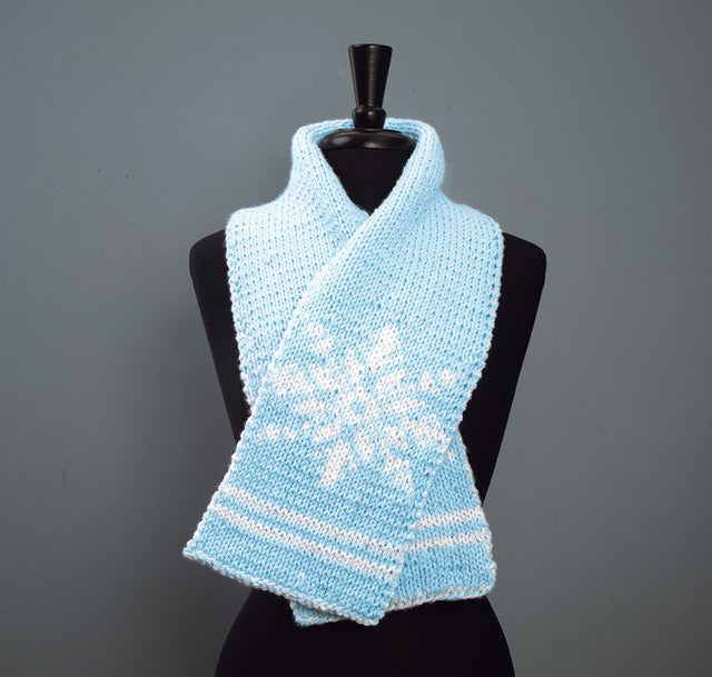 Colours reversed on opposite side. A fast project with step by step instructions for beginners wanting to learn. Kit includes Mary Maxim Starlette Sparkle yarns and instructions. Requires needles size 5.5 mm. Finished size: 7.5 x 46". Intermediate Knit.