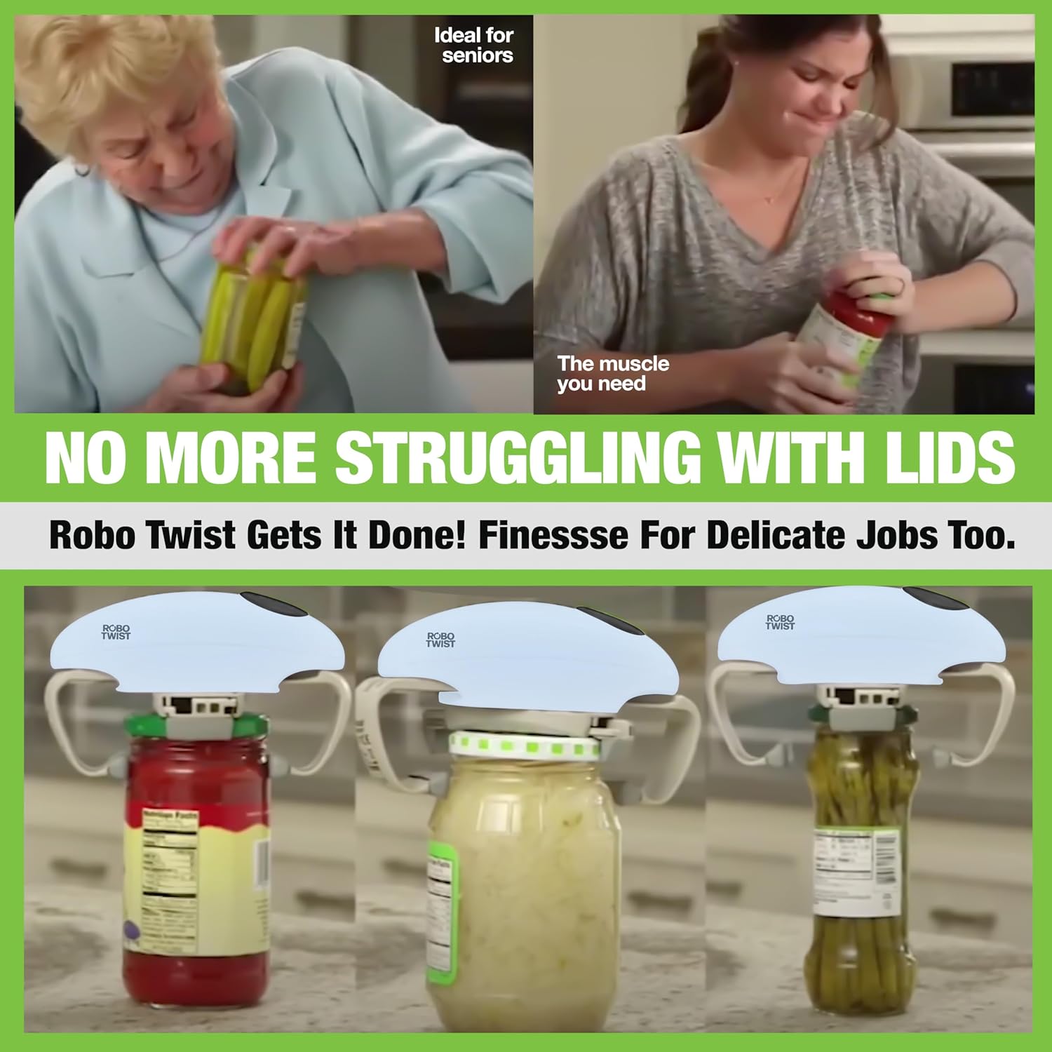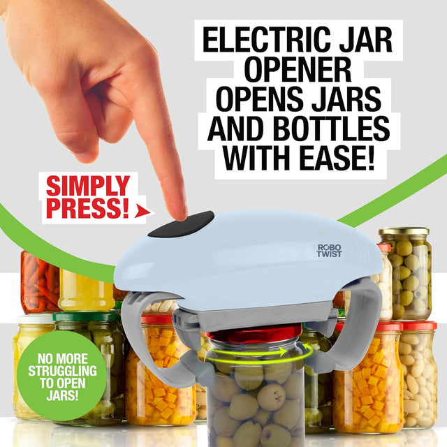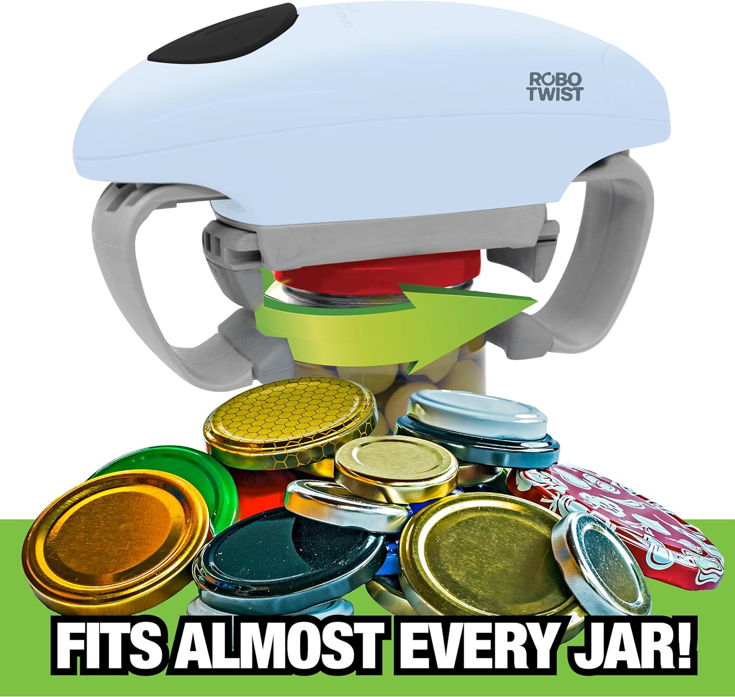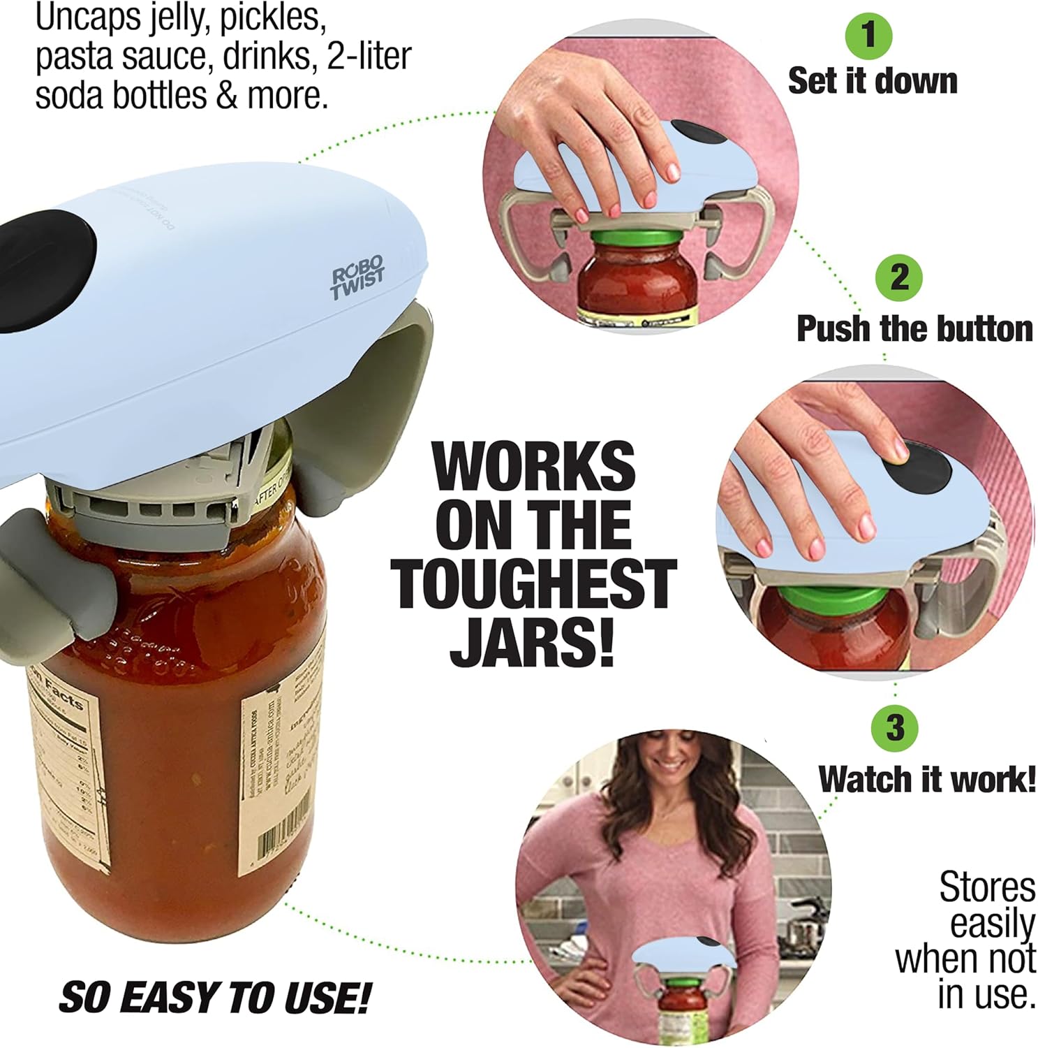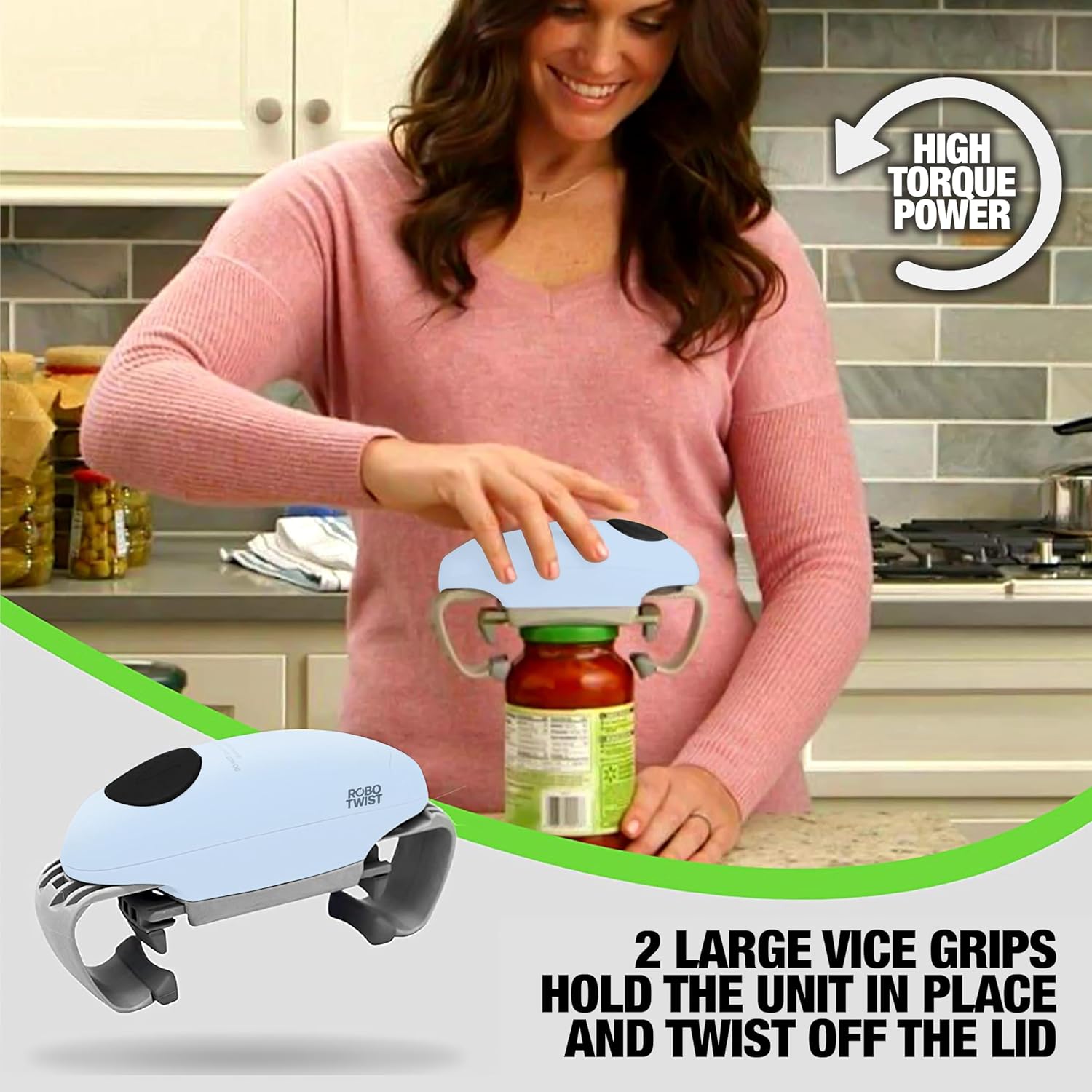 The RoboTwist electric jar opener makes opening jars effortless and quick. Simply place it on the lid, press the button, and let the powerful vice grip and twist the lid open for you. Designed to handle even the toughest jars, it eliminates the struggle and strain on your hands. Compact and easy to use, it’s perfect for anyone who wants convenience in the kitchen. Powered by 2 AA batteries (not included), RoboTwist is your reliable helper for opening jars with ease every time. Say goodbye to stubborn lids and hello to hassle-free cooking.