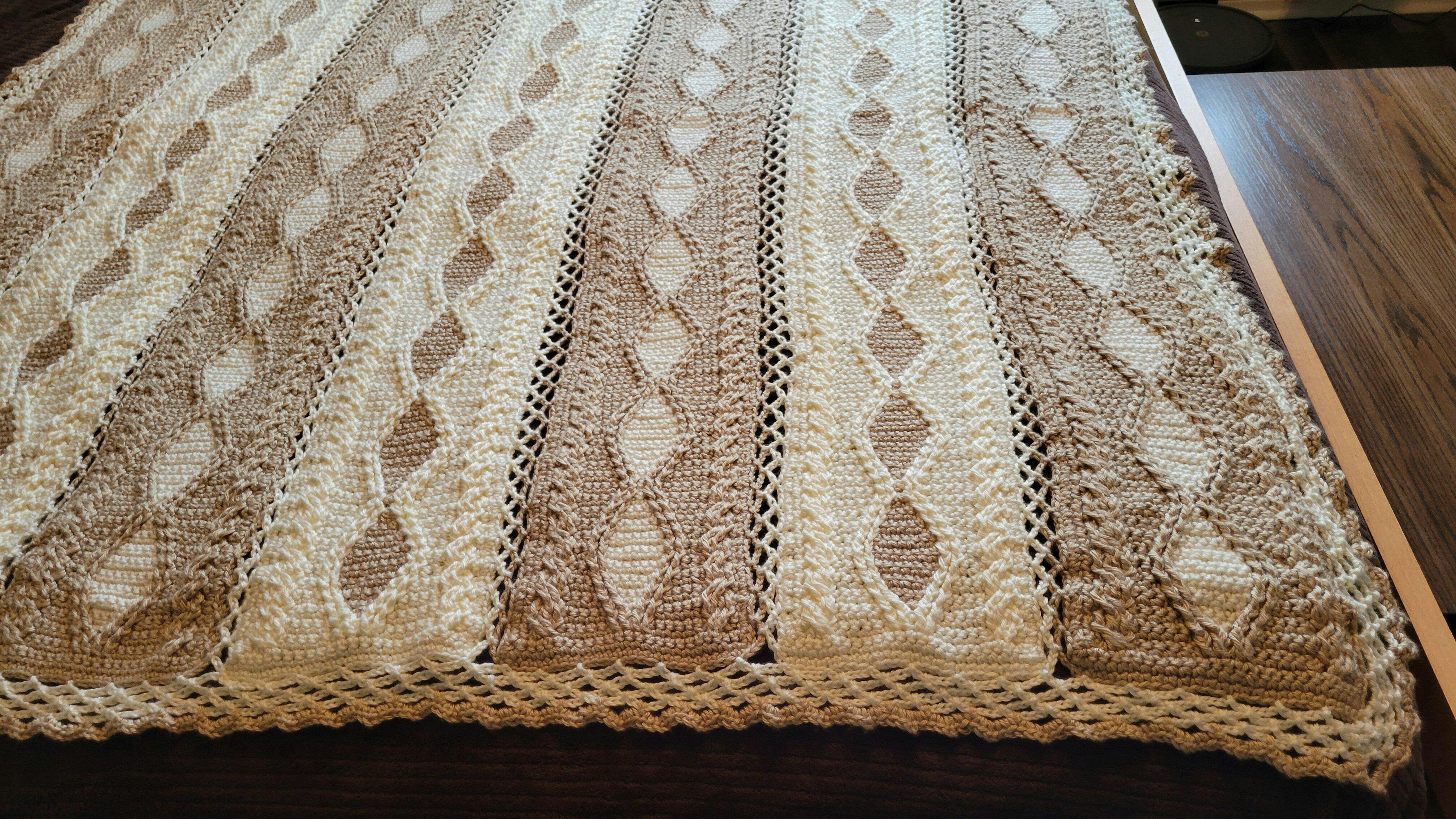 This beautiful neutral colored diamonds afghan will match any decor. Designed by Jill Wright. Kit includes Caron Simply Soft yarns and instructions. Requires crochet hooks size 5.0 & 6.0 mm. Finished size 54 x 58". Intermediate Crochet.