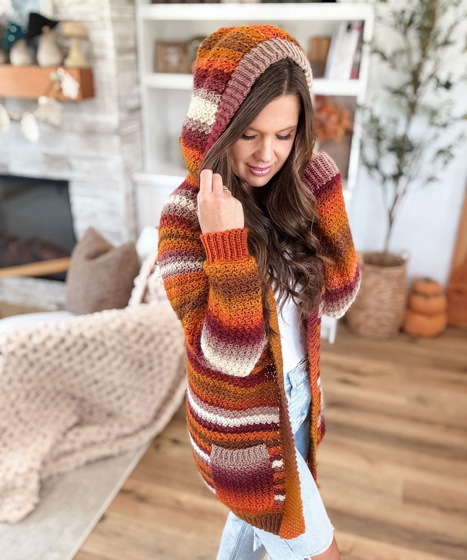 Slip into effortless style with The Suzette Long Cardigan, a top-down raglan design that's as fun to wear as it is to make. This cozy layer features long sleeves, a relaxed open front, and surprisingly roomy pockets—because who doesn't love a place to stash your stuff? The optional hood adds versatility for those days when you need extra coziness, while gorgeous colour transitions keep things visually interesting. Perfect for layering, Suzette Cardigan is your new go-to for comfortable, casual elegance. Designed by MJ's Off The Hook. Kit includes Mary Maxim Prism yarn and instructions. Requires crochet hook size 5.0 & 5.50 mm. Tag not included. Sizes: XS-5X. Intermediate Crochet.