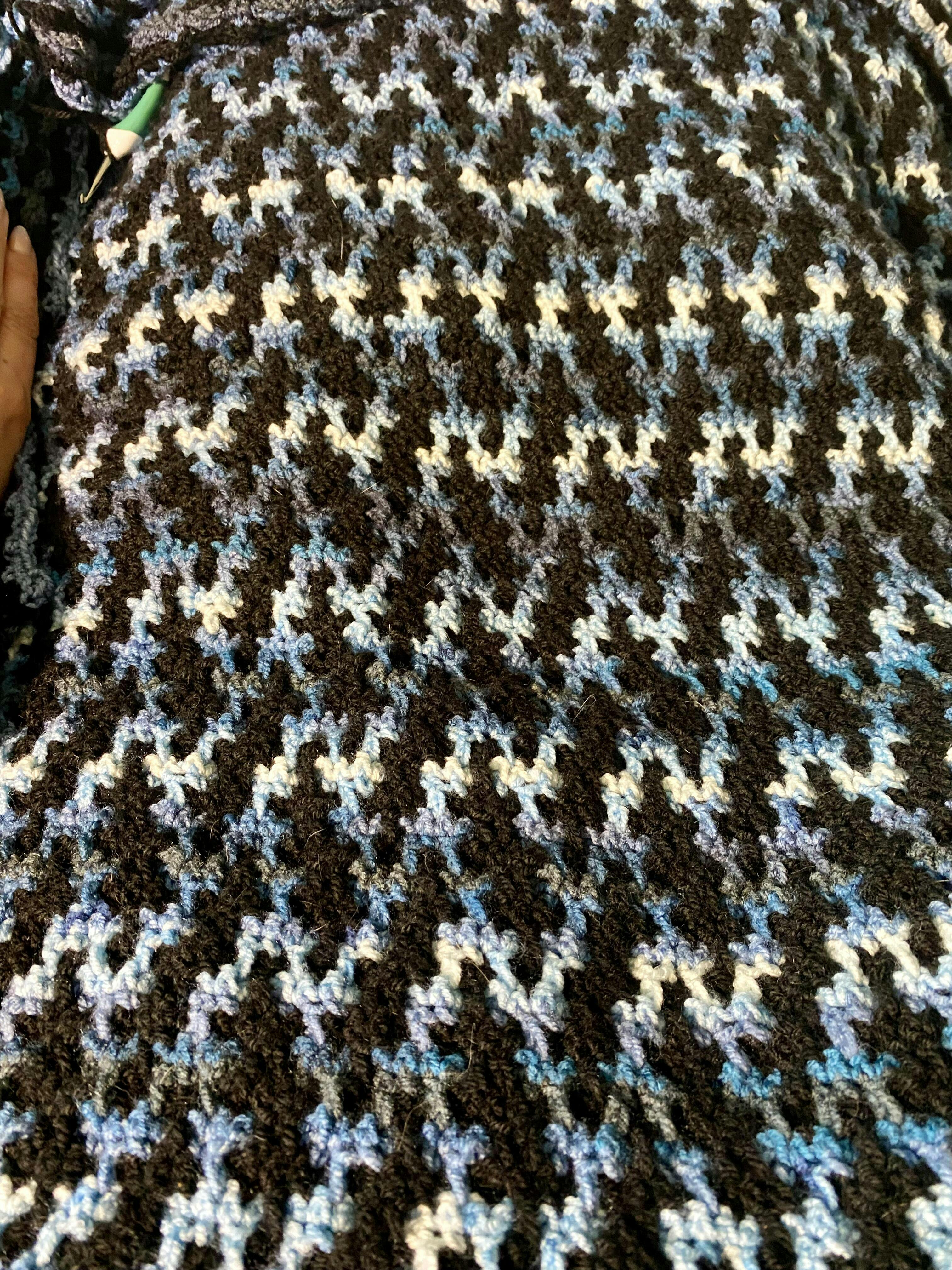 Transform your living space with the Into The Matrix Throw! This stunningly colourful and uniquely patterned throw is sure to be a crowd favourite. Not only does it add warmth to any room, but it also makes a statement with its eye-catching design. Create cozy and fashion with this must-have piece! Designed by Bag-O-Day Crochet. Kit includes Premier Colorfusion DK & Mary Maxim Mellowspun yarns and instructions. Requires crochet hook size 4.0 mm. Finished size: 53 x 58". Intermediate Crochet.
