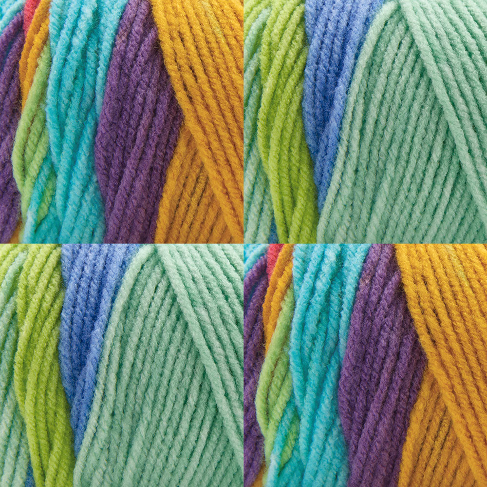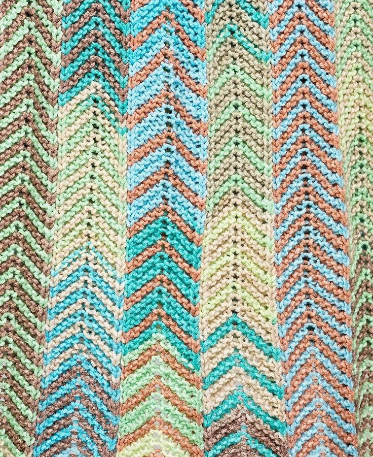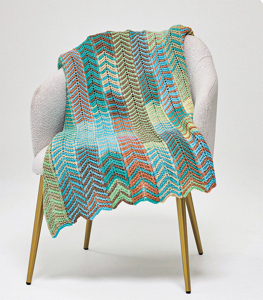 Brighten any space with this cheerful throw featuring a playful chevron pattern in vibrant, multi-coloured panels. Each section is knit separately then sewn together, creating a dynamic modern design that's as fun to make as it is to display. Perfect for snuggling up or adding a pop of colour to your favourite chair. This Rise and Repeat throw celebrates the joy of colourful creativity! Kit includes Premier Trendy yarns and instructions. Requires needles size 5.50 mm. Finished size: 36 x 52". Easy Knit.