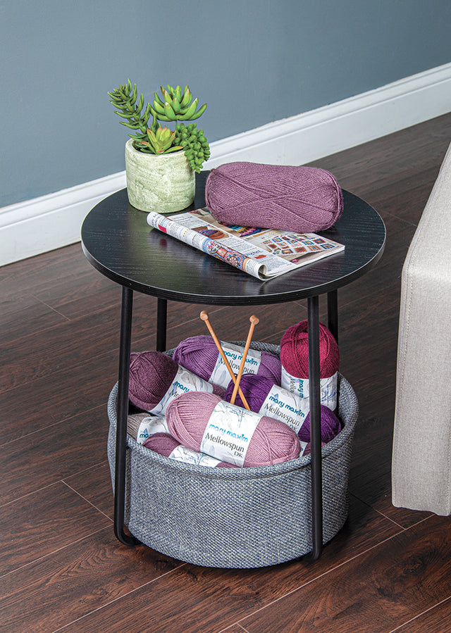 Perfect for small spaces, this modern round side table combines style and storage. The 17.5" diameter x 19.5" high table paired with the 15.5" diameter x 7" high basket provides space for yarn, books or everyday essential. Use in your livingroom, bedroom, craft room and many more places. Simple design with clear instructions allows setup in just 5-10 minutes. Contents not included.