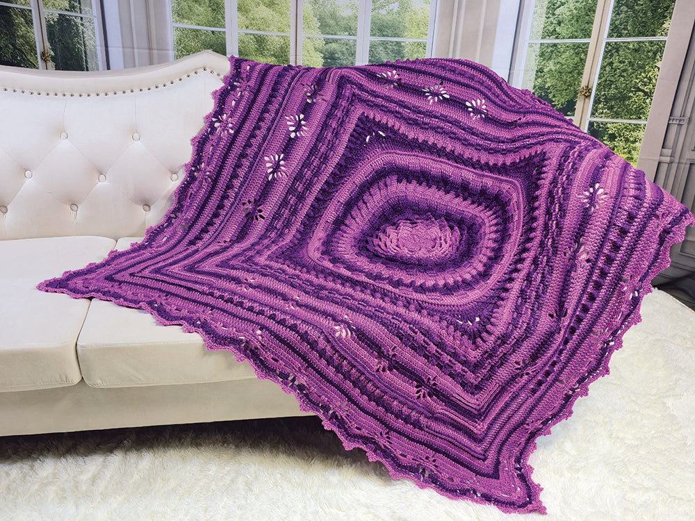 Experience the Sweet Mother Love Afghan, a beautifully crafted piece showcasing an intricate blend of stitches. Starting with a captivating round lotus center, the pattern gracefully expands outward into a delicate, lacy square. The finishing touch of subtle picot edging adds an elegant, refined detail that enhances its charm. Perfect for adding warmth and a touch of timeless beauty to any room, this afghan makes an ideal gift or a cherished heirloom for your home. Its exquisite design and thoughtful craftsmanship invite you to wrap yourself in comfort and style. Designed by Bag-O-Day Crochet. Kit includes Bag-O-Day Tonal Hues yarn and instructions. Requires crochet hook size 5.50 mm. Finished size: 60 x 60". Intermediate Crochet.