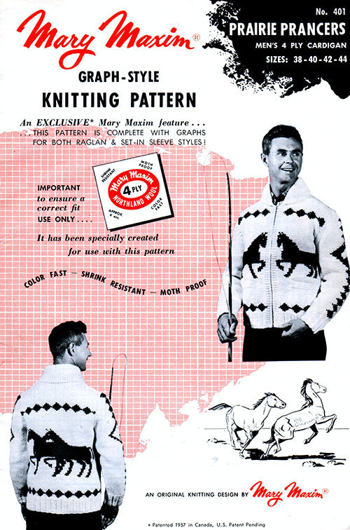 Knit this cardigan with our vintage pattern. Graph-style pattern includes raglan or set-in sleeve instructions. Originally knit with Mary Maxim Northland Wool, a bulky weight yarn that had 80 yards per skein, we now offer a great selection of bulky yarns to suit your style, including Mary Maxim Titan. Be aware yardage may be different. Materials List: Sz 38-40-42 MC (11 skeins), Sz 44 (12 skeins). CC1 Horses and Trim All Sizes (1 skein). CC2 Horses and Trim All Sizes (2 skeins). You'll need U.S. 7 (4.5 mm) and 10 (6 mm) needles to bring it together. Fits sizes 38-40-42-44. This design is also available in Ladies'/Youth and Children's sizes! Intermediate knit.