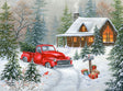 A cozy log cabin nestled in snowy woods, its warm windows glowing invitingly against the winter night. The cheerful vintage red pickup truck pulls up to the door, its bed loaded with the perfect Christmas tree for the family. This charming jigsaw puzzle captures all the magic of a classic holiday homecoming—complete with twinkling lights, frosted trees, and nostalgic charm. Perfect for puzzle enthusiasts and holiday lovers alike, it's a delightful way to celebrate the season while creating lasting memories with loved ones. Size: 24 x 18". 500 pieces.