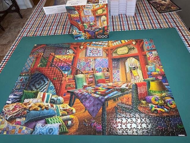 Step into a world bursting with creativity and colour with the Quilt Shop Jigsaw Puzzle. This vibrant scene invites you to explore a shop filled with beautifully patterned quilts and a dazzling array of fabrics, all set for an exciting quilting bee to begin. Perfect for craft enthusiasts and puzzle lovers, this puzzle offers a rewarding challenge wrapped in warmth and charm. As you piece together each colourful fragment, you'll feel inspired by the rich textures and inviting atmosphere, making it an ideal way to relax and spark your own creative spirit. Celebrate the art of quilting and connection with every piece! Size 27 x 20". 1000 pieces.