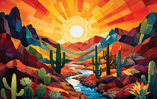 Experience the vibrant beauty of the Southwestern desert with the Southwestern Sunrise Jigsaw Puzzle. Featuring a stylized artistic depiction of the sun rising over rugged mountain terrain, this puzzle brings vivid colours and bold shapes to life, offering a visually striking challenge. Perfect for puzzle enthusiasts and art lovers alike, it provides both relaxation and a sense of accomplishment as you piece together the stunning sunrise scene. Enhance your collection with this captivating puzzle that celebrates nature’s spectacular morning light in a unique and engaging way. Size 24 x 15". 550 pieces.