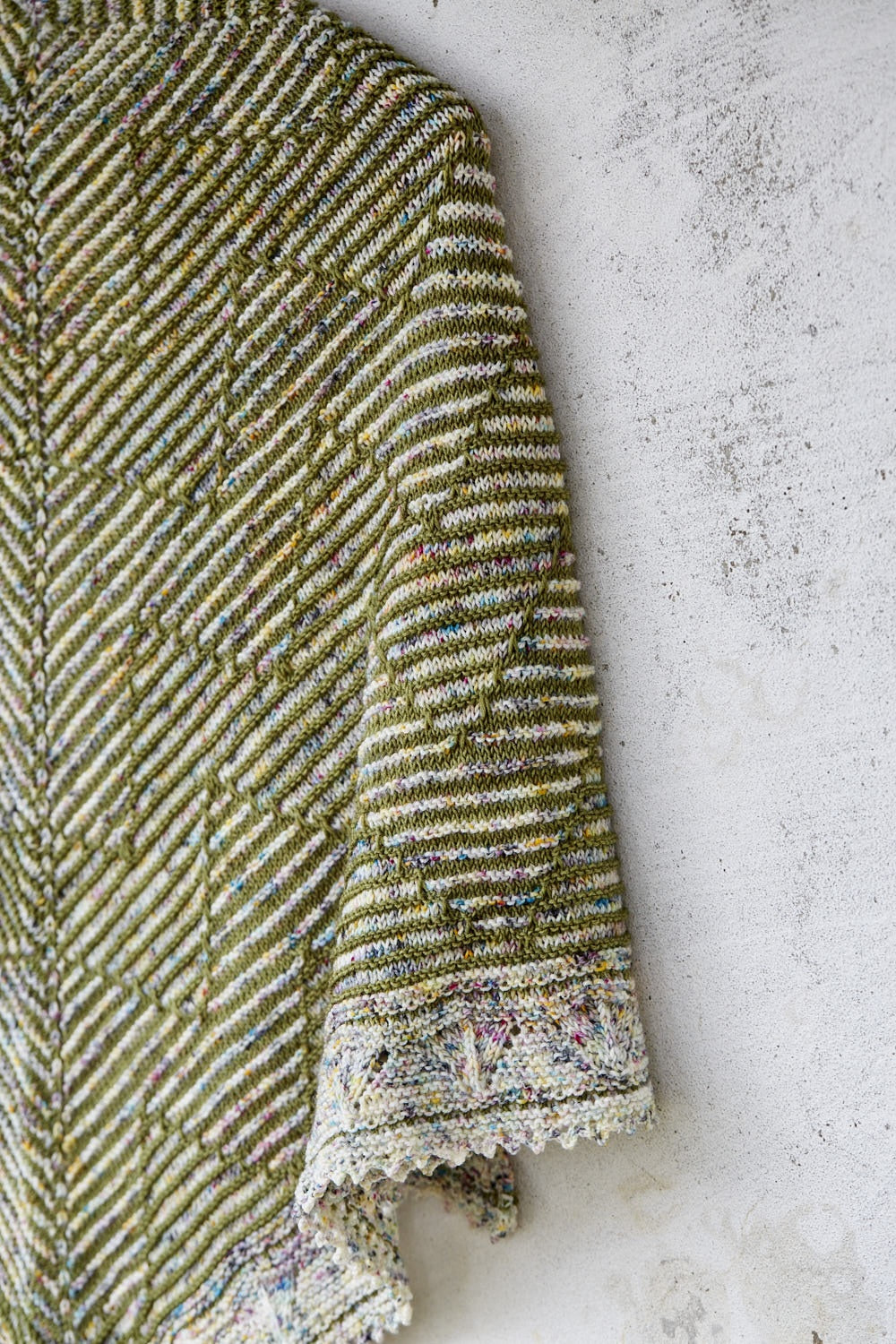 Rhythmic shawl structurally has the shape of a class triangle shawl knitted from the top down. It has been designed with shadow knitting techniques. The technique is very simple in principle. It uses garter stitch and stockinette stitch together. The side garter ridges of stockinette stitches create a shadow pattern that is only visible when the person wearing it moves. Kit includes Gusto Wool Carmen yarn and instructions. Requires needles size 3.25 mm. Intermediate Knit.