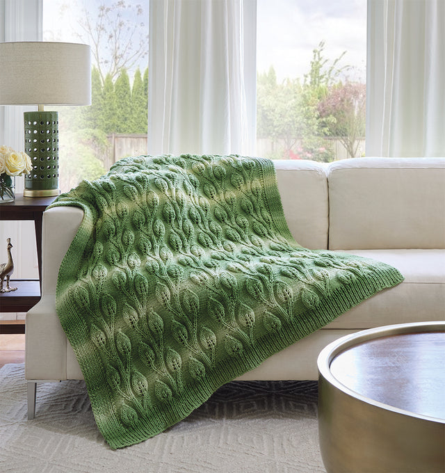The Climbing Vines Afghan features a bold, raised leaf pattern that instantly becomes a captivating focal point in any room. Its detailed design brings a sense of nature indoors, adding both texture and warmth. The gentle gradation of colours enhances the visual depth, creating a dynamic and inviting look. Crafted for comfort and style, this afghan not only beautifies your space but also provides cozy warmth, making it perfect for relaxing evenings or accenting your décor with a touch of sophistication. Designed by Billie Birchfield. Kit includes Red Heart Super Saver yarn and instructions. Requires 36" (90 cm) circular needle size 5.0 mm. Finished size: 40 x 53.5". Intermediate knit.