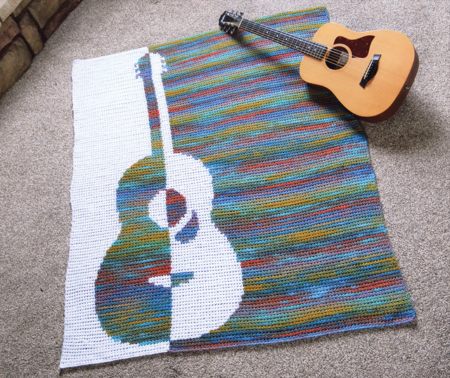 Wrap yourself in creativity with the Grandioso Guitar Blanket. Designed by Sweet Potato 3, for music enthusiasts, its bold meandering colors and simple white yarn contrast make it the perfect addition to any home. Get inspired and make a statement with this unique and eye-catching blanket! Kit includes Red Heart Roll With It Melange & Caron Simply Soft yarns and instructions. Requires crochet hooks size 5.50 & 6.50 mm. Finished size: 40 x 50". Intermediate Crochet.