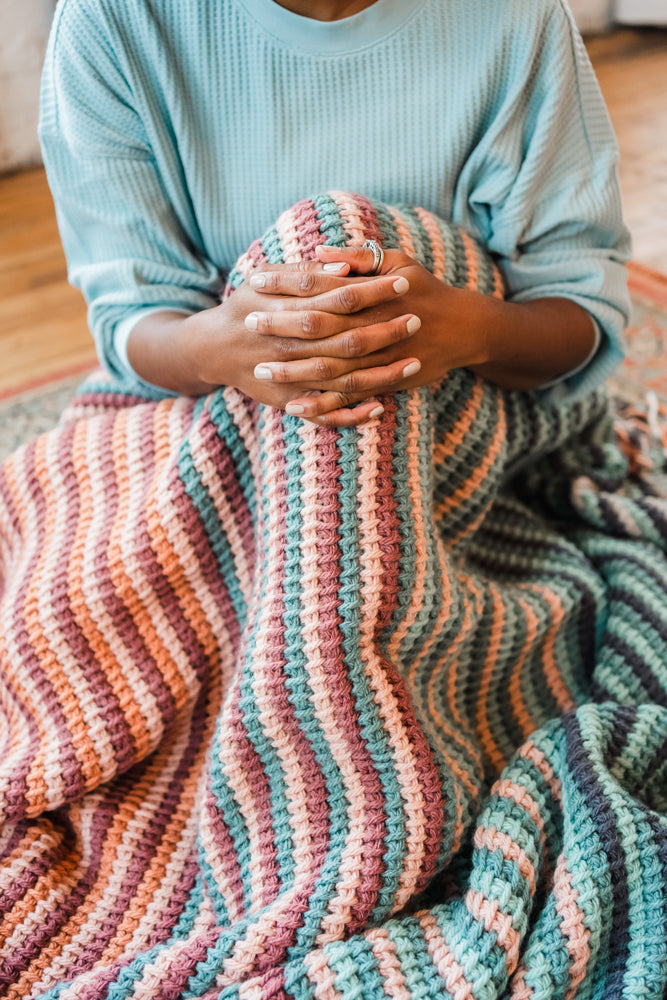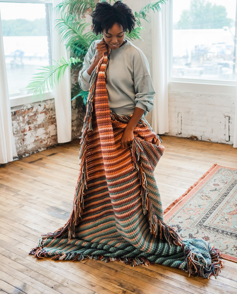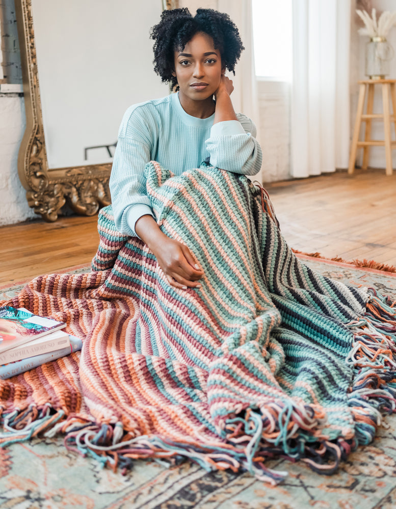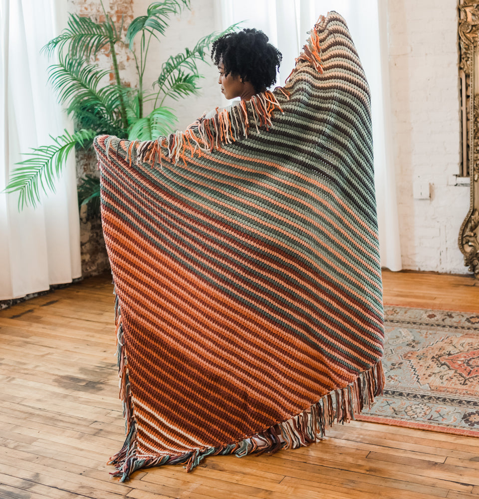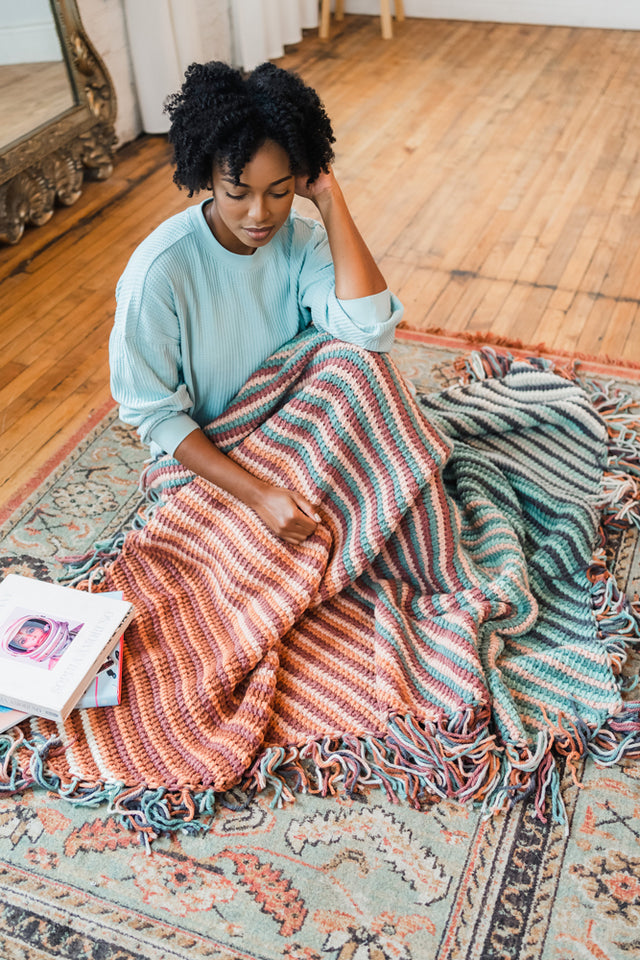 Experience ultimate comfort with our Amber Afghan! Its diagonal striping in elemental hues will bring warmth and coziness to any room. Create with or without the fringe for the perfect look. Dare to be enveloped in its super softness – you won’t want to snuggle under anything else! Designed by Toni Lipsey_TL Yarn Crafts. Kit includes Lion Brand Hue + Me yarns and instructions. Requires Tunisian crochet hook size 9.0 mm with 32" cable. Finished size: 42 x 72". Intermediate Crochet.