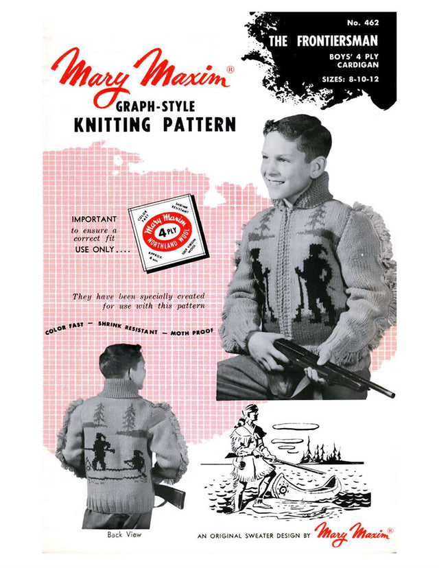 Create your own custom cardigan with our original frontier-inspired design, using our fun, easy-to-read graph pattern! This original design was created using Mary Maxim Northland yarn, which had 80 yds per skein at that time. But now, with a larger variety of bulky yarns to choose from, you can customize this project to match your unique style. Keep in mind that yardage may differ. We recommend Mary Maxim Titan! Material List: Sz 8 MC (5 skeins), Sz 10 (6 skeins), Sz 12 (7 skeins). All sizes: Frontiersman (1 skein), Trees (1 skein). All you need are U.S. sizes 6 (4 mm) and 9 (5.5 mm) needles to begin! Fits children sizes 8-10-12—Intermediate knit.