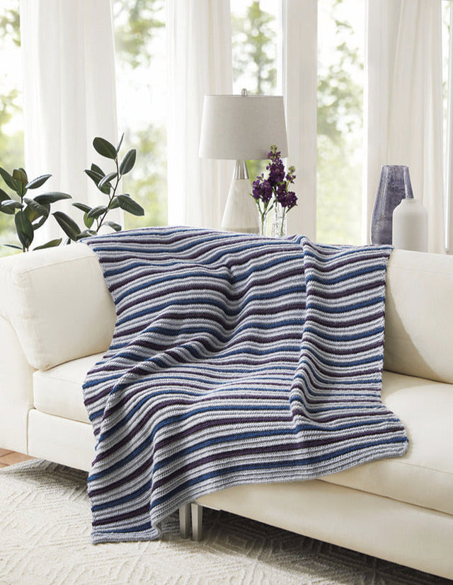 Indulge in the warmth and style of our Between the Lines Afghan! Featuring bold, modern stripes in masculine colours, this afghan is perfect for adding a cozy touch to any space. Its super soft acrylic yarn is also easy to care for, making it a convenient addition to your home decor. Crafted with Mary Maxim's Best Value worsted weight yarn and a 5.50 mm crochet hook, this afghan pattern is perfect for any crochet enthusiast. With the amazing selections of worsted weight brands we carry in today's modern colours, the combinations are endless! Keep in mind yardage varies. Finished size: 44 x 55"—Intermediate Crochet.