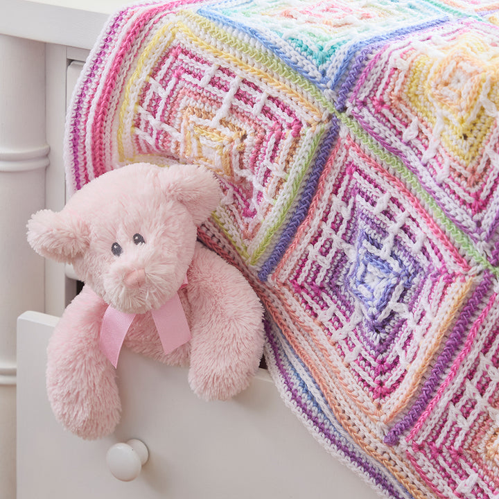 Ajoutez une touche de couleur à la chambre de votre bébé avec notre couverture pour bébé Patchwork Prism ! Fabriquée avec un look géométrique moderne, chaque carré est travaillé individuellement puis crocheté ensemble puis la bordure est ajoutée. Ce sera certainement un héritage bien-aimé pendant des générations. Et avec sa construction douce au crochet, votre tout-petit restera au chaud et confortable. Conçu par Handmade Stacy J. Le kit comprend les fils Mary Maxim Prism et Mellowspun DK et les instructions. Nécessite un crochet de taille 4,50 mm . Taille finie : 34,5 x 34,5". Crochet intermédiaire.