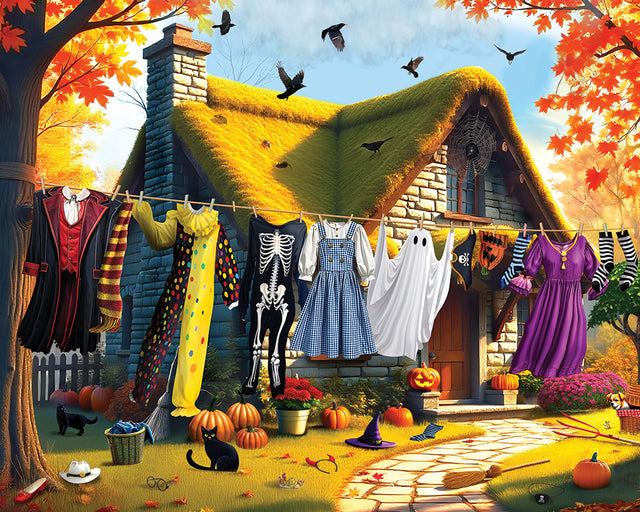 Prepare for a fun-filled night with the Halloween Laundry Jigsaw Puzzle. This colourful scene shows all the Halloween costumes freshly cleaned and hanging to dry, ready for the big trick-or-treating evening. Filled with charming details, this puzzle offers an enjoyable challenge that captures the excitement before the festivities begin. Perfect for puzzle lovers and Halloween fans alike, it’s a delightful way to celebrate the season while sharpening your focus. Size 23.5 x 18". 500 pieces.