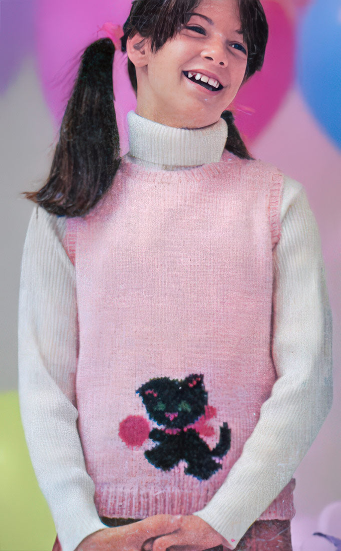 Ce ravissant gilet sans manches à motif chaton arbore un motif exclusif de type graphique qui fera assurément plaisir ! Son design ludique en fait une pièce polyvalente qui s’accorde aussi bien avec des jupes qu’avec des jeans, pour toutes les occasions : école, église, anniversaires ou jeux. Tricotez ce gilet adorable et regardez votre enfant prendre plaisir à le porter encore et encore. Conçu avec notre laine sport la plus vendue, Mary Maxim Mellowspun, qui offrait 420 yards (380 m) par écheveau de 4 oz (113 g) à l’époque. Découvrez nos vastes gammes de laines sport de toutes vos marques préférées, y compris Mellowspun ! Veuillez noter que les métrages peuvent varier. Liste des fournitures : Tailles 2 à 6 : MC (113 g). Tailles 8 à 12 : MC (227 g). Toutes les tailles : CC1 (18 m), CC2 (4 m), CC3 (1,8 m), aiguilles à tricoter n° 3 (3,25 mm) et n° 6 (4,25 mm). Convient aux tailles 2 à 12 – Niveau intermédiaire.