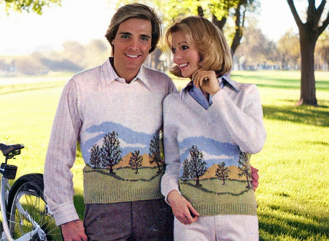Imaginez-vous pédaler dans un parc pittoresque avec votre personne préférée, tous deux vêtus de gilets tricotés assortis, ornés d'un charmant paysage. Notre modèle exclusif, de type grille, vous permet de réaliser facilement ce motif. Conçu avec la laine Mary Maxim Mellowspun, qui offrait à l'époque 420 yards (38 m) par écheveau de 4 oz (113 g). Découvrez toute notre gamme de laines sport de haute qualité, y compris la Mary Maxim Mellowspun. Veuillez noter que les quantités peuvent varier. Liste des fournitures pour toutes les tailles : blanc (8 oz), avocat clair (2 oz), avocat moyen (40 m), or, marron (30 m), bleu (80 m), aiguilles à tricoter n° 3 (3,25 mm) et n° 5 (3,75 mm). Convient aux tailles homme/femme 32-34-36-38-40-42-44 – Niveau intermédiaire.
