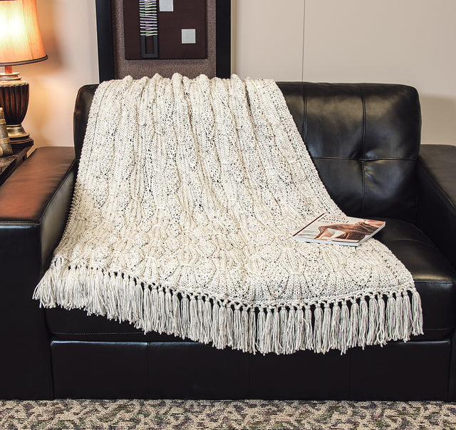 Les côtes et les losanges se combinent pour créer ce jeté saisissant pour n'importe quel décor. Conçu par Emily Armstrong. Le kit comprend du fil Mary Maxim Aran Irish Twist ou Tweed et des instructions. Montré en Tweed. Nécessite des aiguilles circulaires de 36" (90 cm) de taille 6,0 mm . Taille finie 46 x 58". Tricot intermédiaire.
