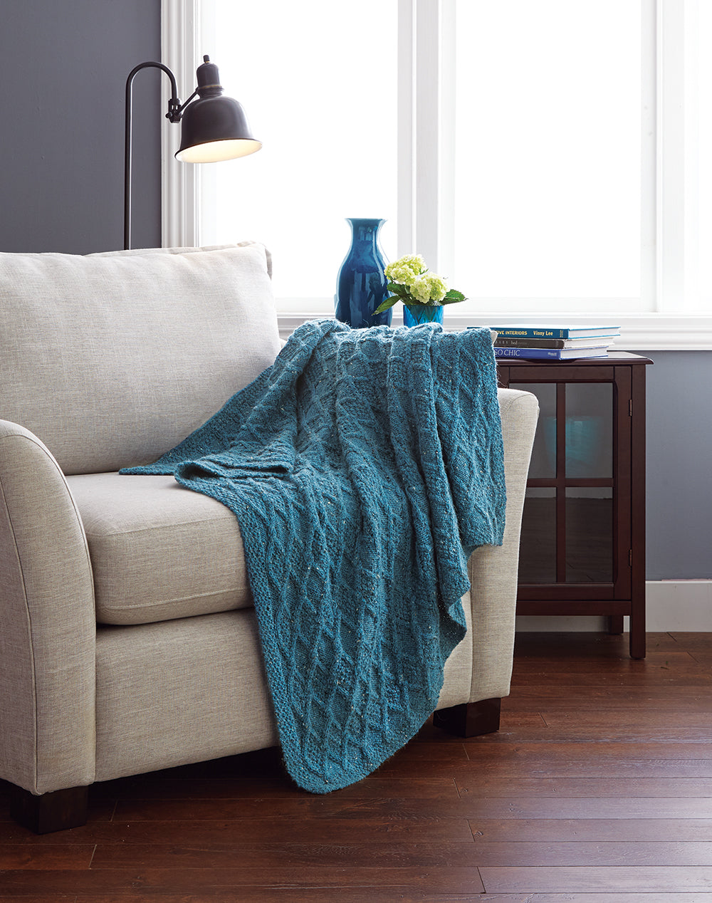 Diamants chics en fil luxueusement doux. Le kit comprend du fil Mary Maxim Alpaca Tweed et des instructions. Nécessite une aiguille circulaire de 36" (90 cm) de taille 5,0 mm . Taille finie : 43 x 53". Tricot intermédiaire.