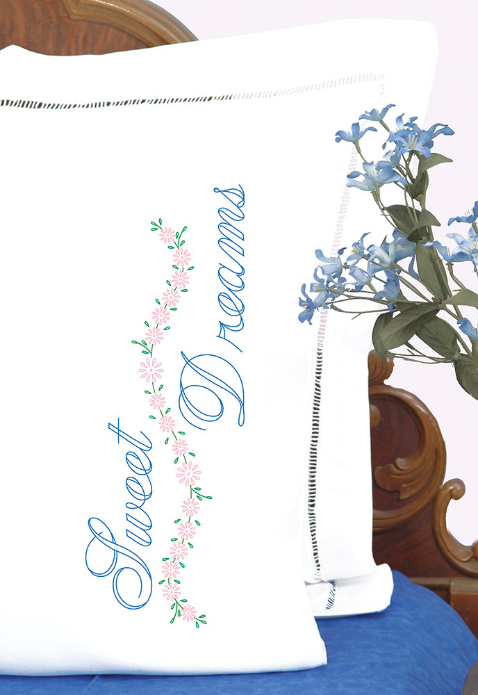 Embroider these stamped white pillowcases to compliment your bedroom decor. Includes 2 stamped standard size white poly/cotton pillowcases. Size 20" x 30". Thread kit sold separately.