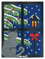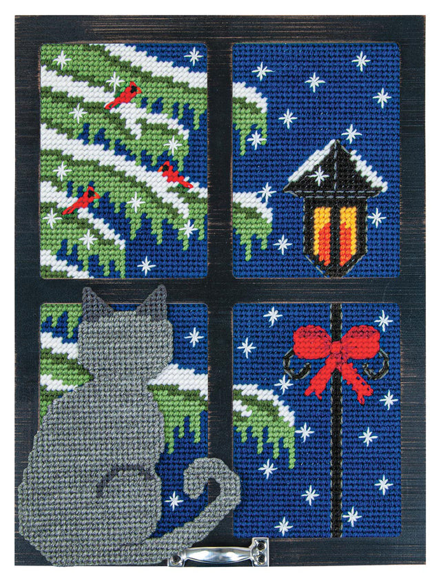 This adorable kitty spies a few bright red cardinals sitting on the snow laden branches of the pine tree. A cute and festive piece to hang on your wall or door. Kit includes black wooden frame, 7 mesh plastic canvas, acrylic yarn and pattern. Size 11.5 x 15.5".