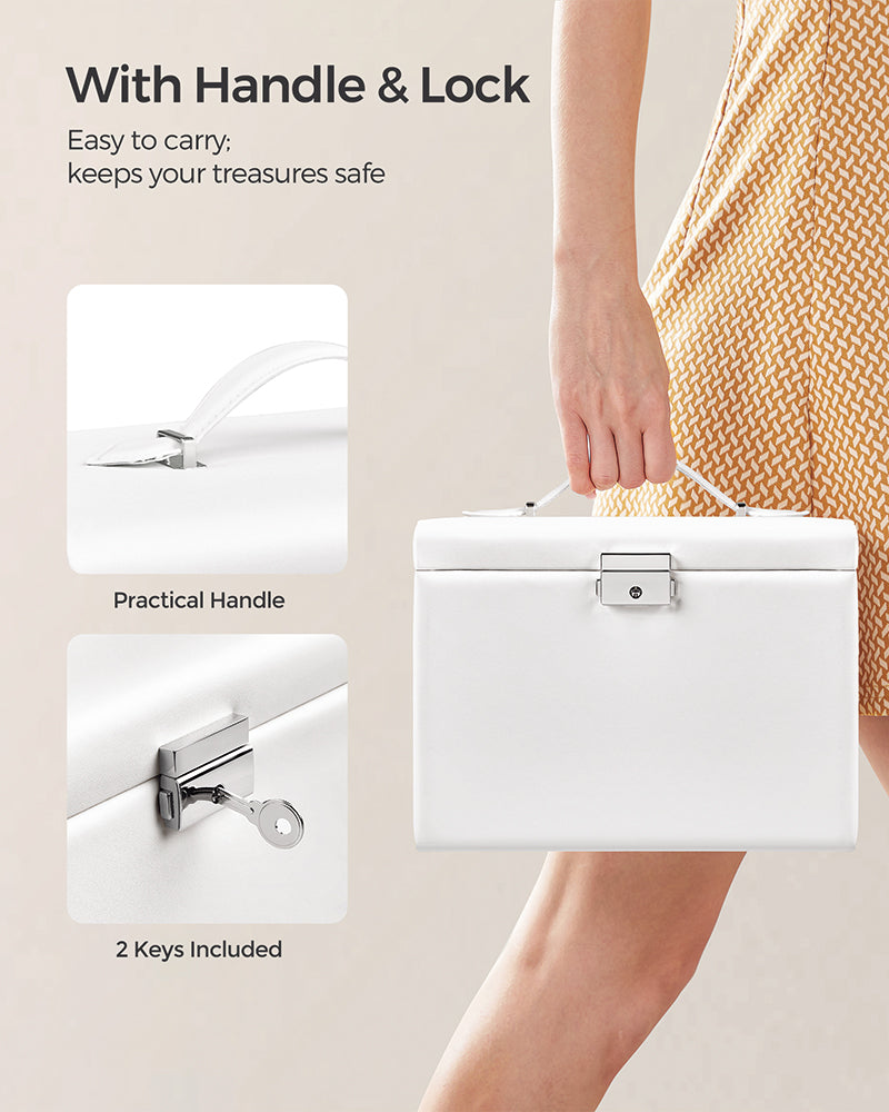 Gardez vos précieux bijoux organisés et en sécurité avec notre boîte à bijoux à 4 niveaux. Avec suffisamment d'espace pour les boucles d'oreilles, les colliers et les bagues, cette boîte comprend des serrures et 2 clés pour plus de sécurité. Dites adieu aux accessoires emmêlés et bonjour à la commodité et à la tranquillité d'esprit. Taille 7 x 9 x 6,5" fermé.