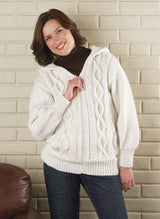 Style aran classique dans cette veste zippée câblée confortable. Le kit comprend du fil Mary Maxim Aran Irish Twist ou Tweed et des instructions. Montré dans Twist. Fermeture éclair non incluse. Nécessite des aiguilles de 4,0 et 5,0 mm . Tricot intermédiaire.