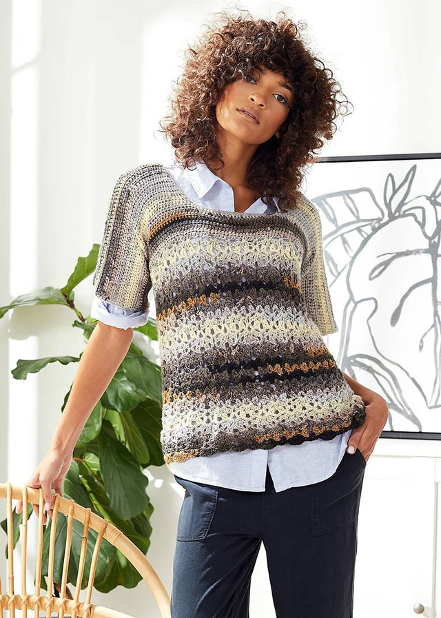 Nécessite 3 (4, 4, 5, 5, 6, 7, 7) écheveaux de fil Premier Colorfusion DK. Montré dans Morning Coffee (non disponible).Haut en dentelle d'automne gratuit est en rupture de stock et sera expédié dès qu’il sera de retour en stock.