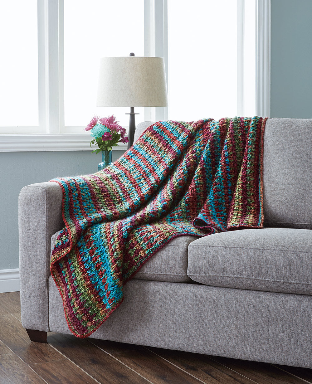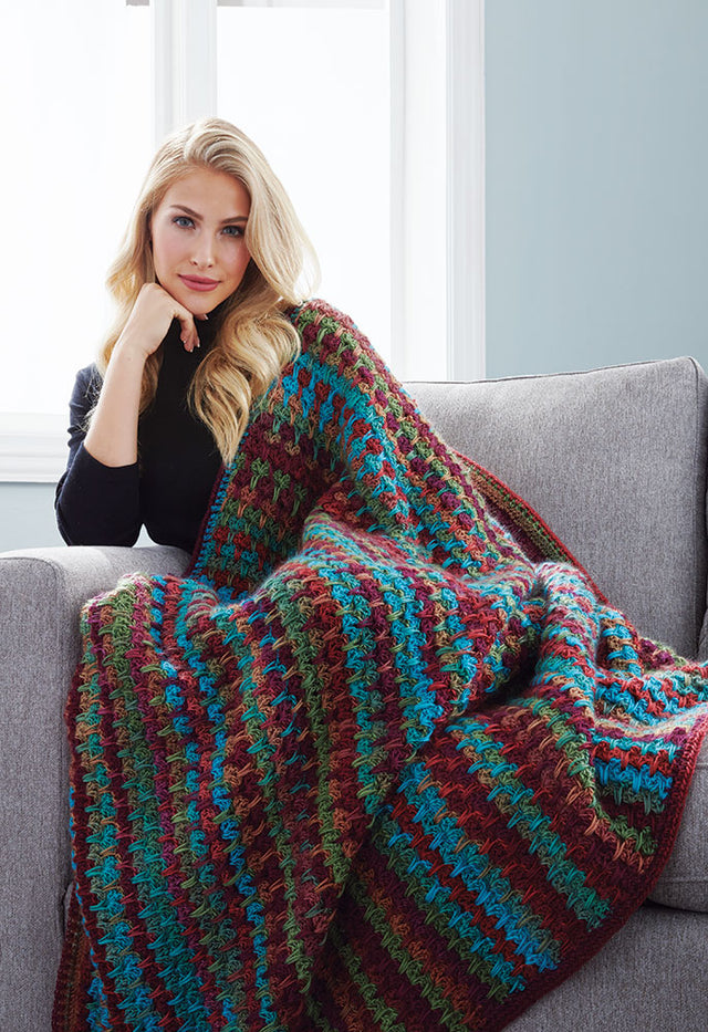Un motif de point intéressant donne une belle pièce finie. Le kit comprend du fil Mary Maxim Prism et des instructions. Nécessite un crochet de 5,0 mm . Taille finie : 48 x 60". Crochet intermédiaire.