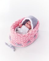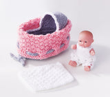 Adorable sac qui se replie en berceau pour votre poupée de 5". Le kit comprend une poupée de 5" et des fils Mary Maxim Starlette pour confectionner une tenue, une couverture et un berceau/sac à main. Nécessite des aiguilles de 4,0 mm et des DPN de 7,0 mm . Tricot intermédiaire.