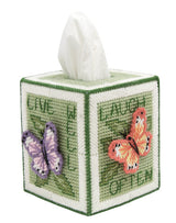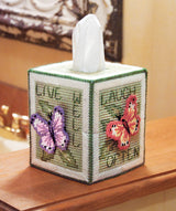 Experience joy every time you reach for a tissue with this Butterfly Plastic Canvas Tissue Box Cover Kit. The colourful Spring butterflies and gentle green background will uplift your mood year-round. With the reminder to "Live Well, Laugh Often, Love Much", it's the perfect addition to any home. Fits boutique size box. Kit includes 7-mesh plastic canvas, acrylic yarns, trims, needle and instructions.