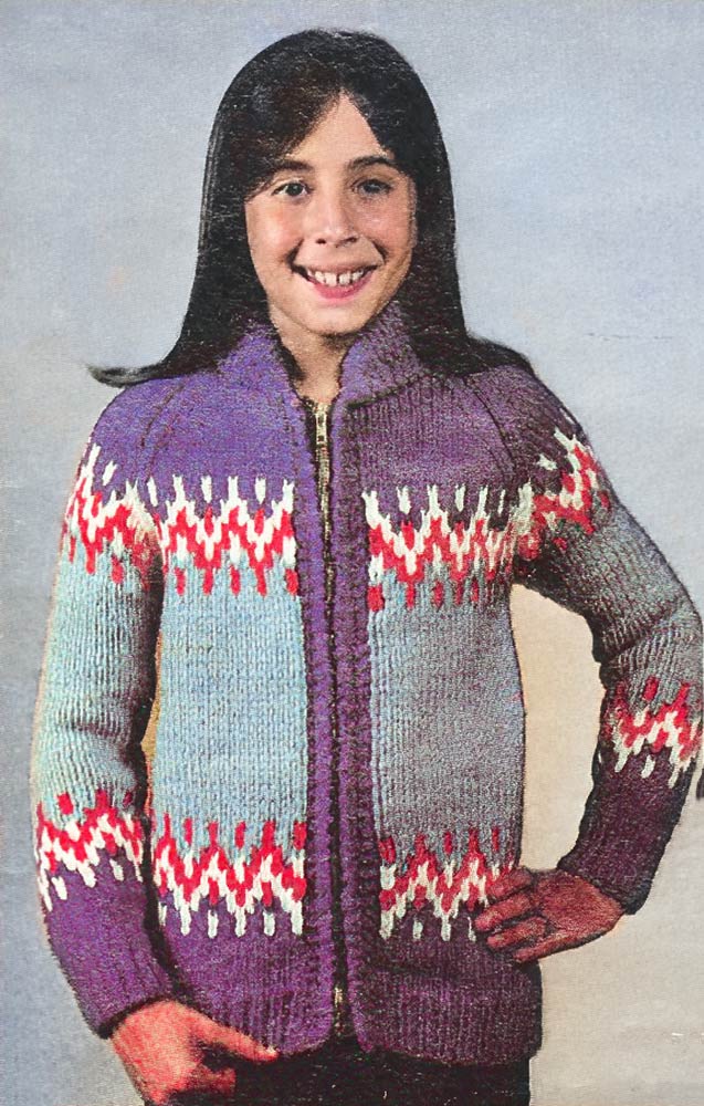 Knit this great cardigan with our vintage pattern. Perfect for everyday use! This original design was created in the 1960s using Mary Maxim Titan, a bulky weight yarn, which had 80 yds per skein at that time. Please note, yardages may have changed. Graph style pattern. Stitch technique is fair isle and colored pattern knitting. Options for collar style include shawl, windbreaker, or flat collar. Materials List: All Sizes MC (3 skeins). CC1 Sz 8 (3 skeins). Sz 10-12 (4 skeins). CC2 & CC3 (1 skein each), knitting needles sizes U.S. 6 (4.25 mm) and 9 (5.50 mm). Fits sizes 8-10-12—Intermediate knit.