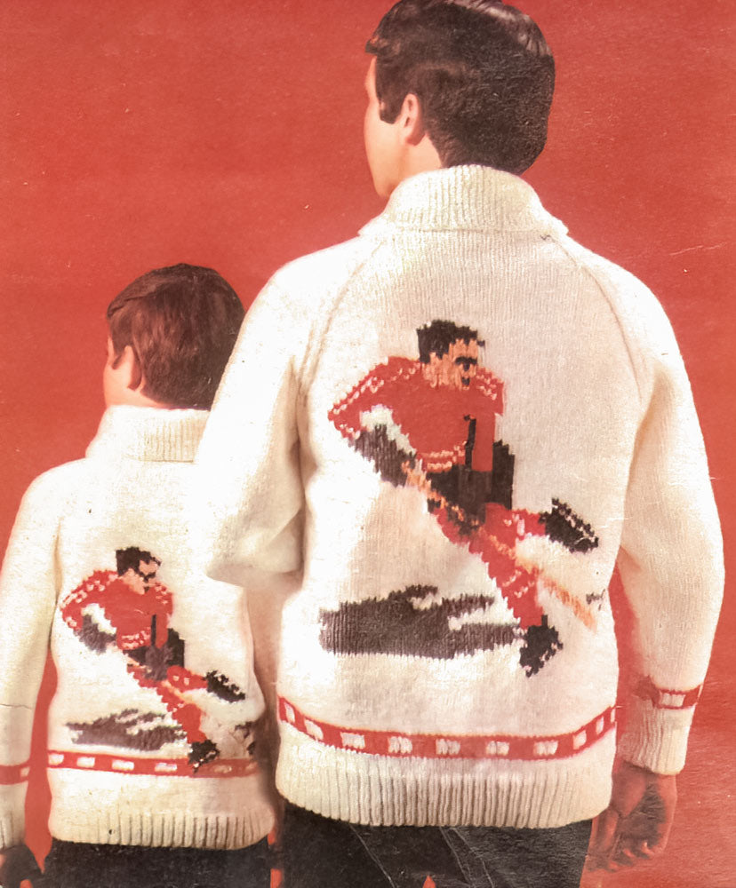 Knit this vintage cardigan using this graph-style pattern. Pattern includes instructions for shawl, flat, or windbreaker collar. Originally, this used Mary Maxim Titan yarn, which had 80 yards per skein. We still carry Mary Maxim Titan yarn, however, yardages may have changed. Materials List: MC Sz 8 (7 skeins), Sz 10-12 (8 skeins). CC1 Red (40 yds), CC2 Black (20 yds), CC3 Ice Lt Grey (20 yds), CC4 Hockey Stick (5 yds), knitting needles size 6 (4.25 mm) and 9 (5.50 mm). Fits sizes children 8-10-12—Intermediate knit. Discover this and other sports-themed cardigans, each available separately.